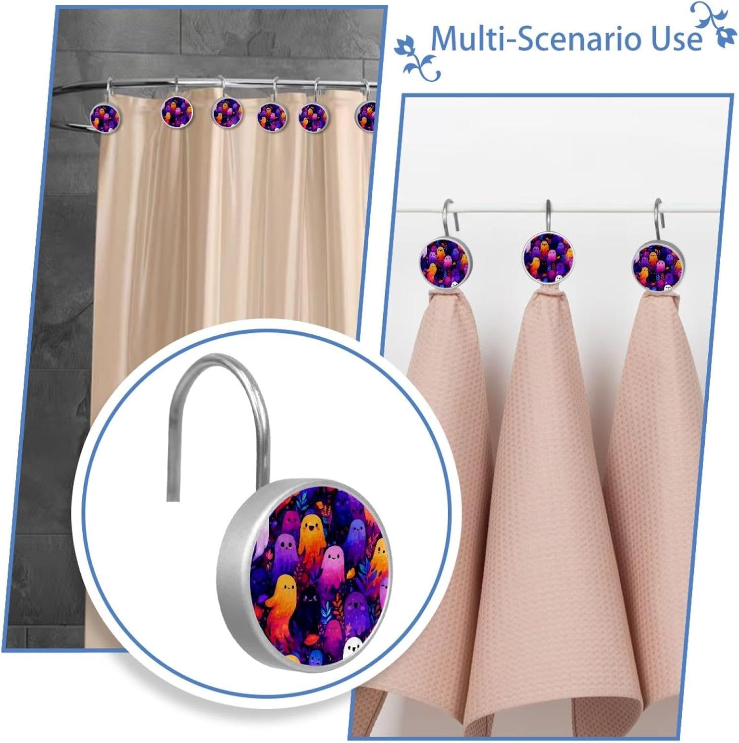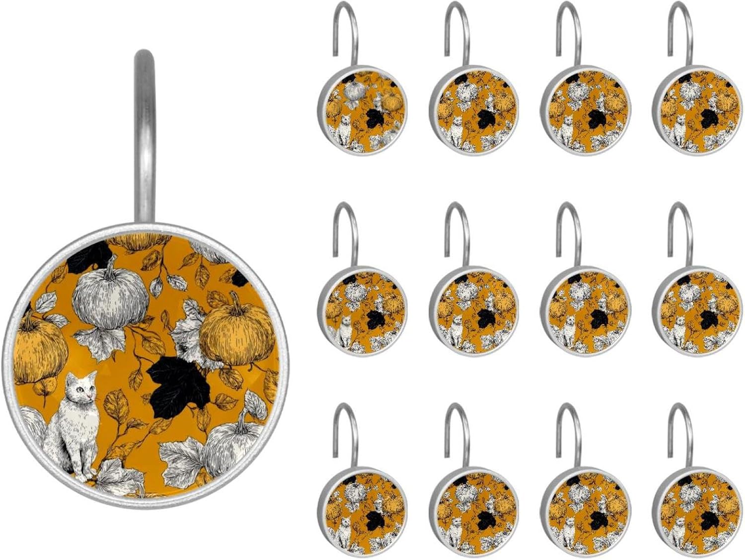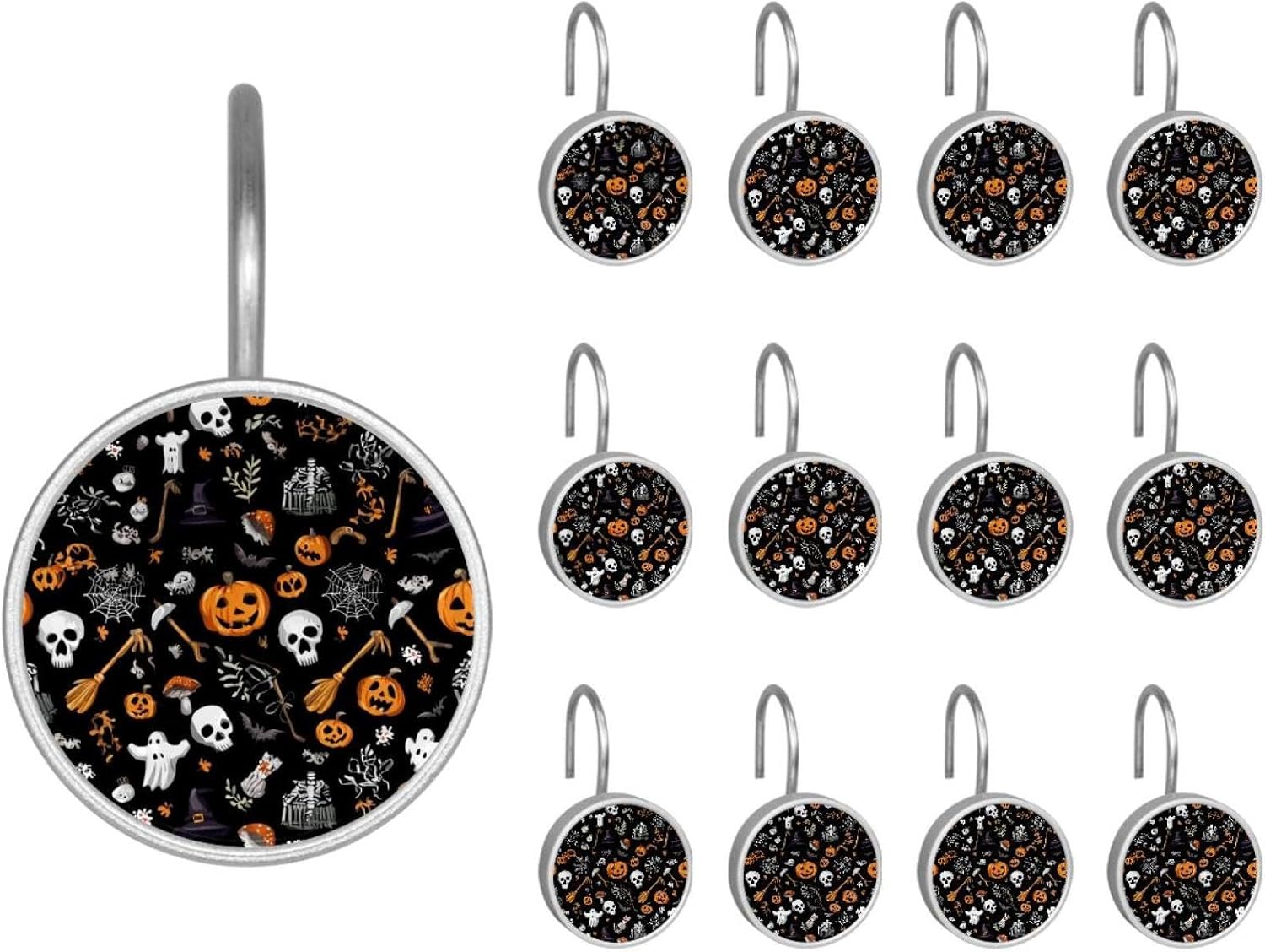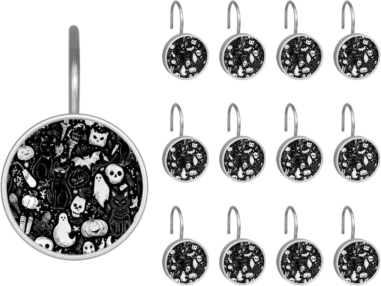 MATERIAL: glass, stainless steel. These shower curtain hooks can be decoration bathroom and will be long-lasting.12 pieces of shower curtain hooks, round crystal glass decoration, printed patterns, silver hooks to match various styles of bathroom shower curtains. SIZE: Crystal glass diameter of round shower curtain hook is 1.45x1.45in/ 3.7x3.7cm. The shower curtain hooks diameter is about 1.1in, 12 pieces shower curtain hooks are suitable for rod of 8-28mm(0.3"-1.1"). RUST RESISTANT:Shower hooks are made of stainless steel and crystal glass, which is durable, rust-proof and corrosion-resistant, it will not rust suitable for wet bathroom environment. EASY TO INSTALL:Hand the shower curtain hooks hold securely on straight or curved shower curtain rods,slid easily and smoothly. Easy to install and decorate your bathroom. BEAUTIFUL AND ELEGANT:Beautiful Love hook add charming scenery for your bathroom, baby room, bedroom, living room, and the gorgeous style is easy to match with any kinds of bathroom shower curtain. EASY GLIDE: Open and close your shower curtain quickly and easily with the Shower Hooks, easily glides on shower curtain rods and tension rods. No snagging; no effort; no hassle PACKAGE: 12 shower curtain hooks in a pack.The bathroom curtain hook has a smooth appearance and can be hung on the pole to pull it at will. Special price 12 sets to meet your needs.
