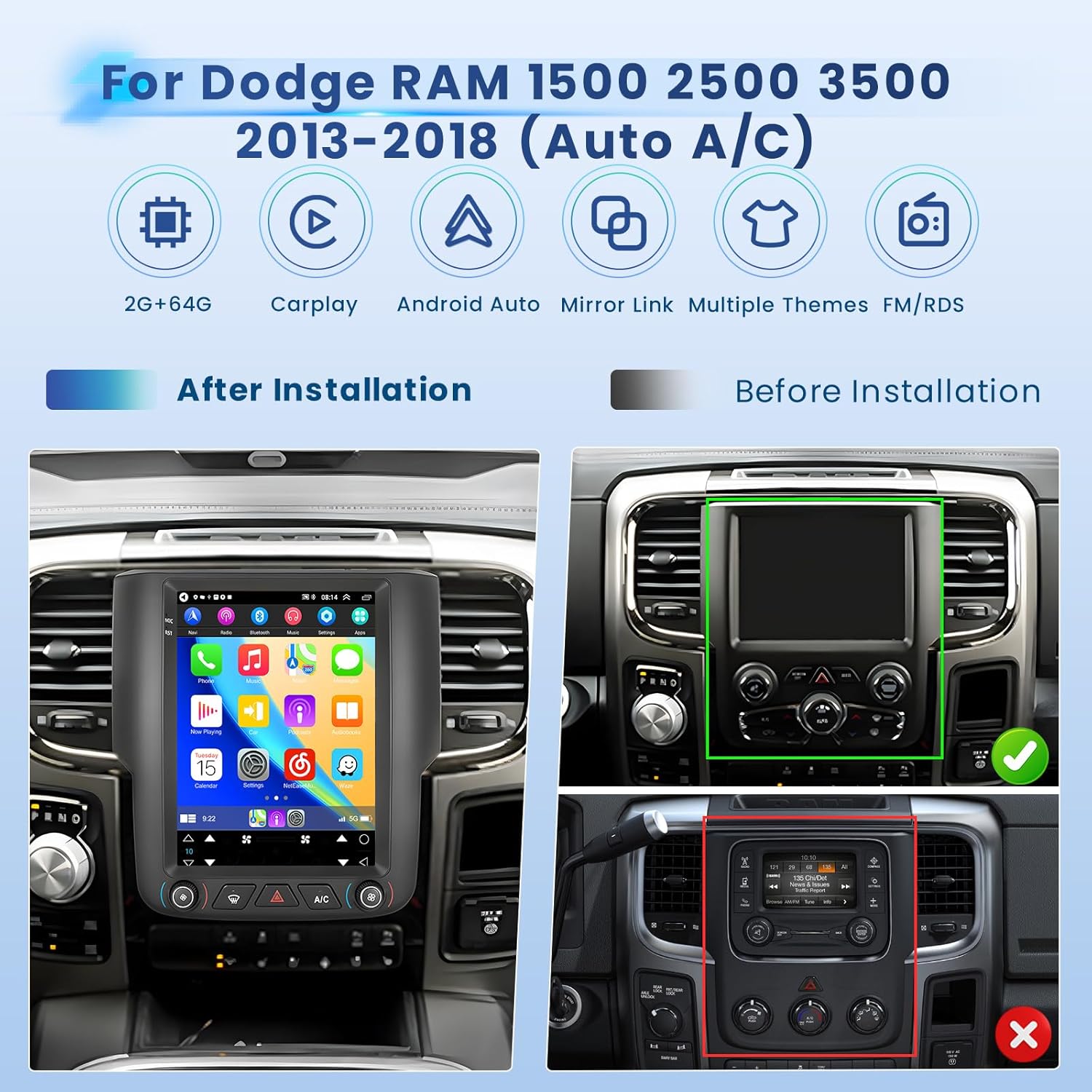 | Additional Features | 768*1024 Resolution, 1080P Video Playback, EQ Setting, 10 Desktop Themes, Hands-free Bluetooth, Touchscreen, FM/RDS Radio, Support Reverse Input, Steering Wheel Learning, Wireless/Wired CarPlay & Android Auto & Mirror Link, Siri/Goo-gle Voice Assistant, GPS Navigation, WiFi/Hotspot Connection |