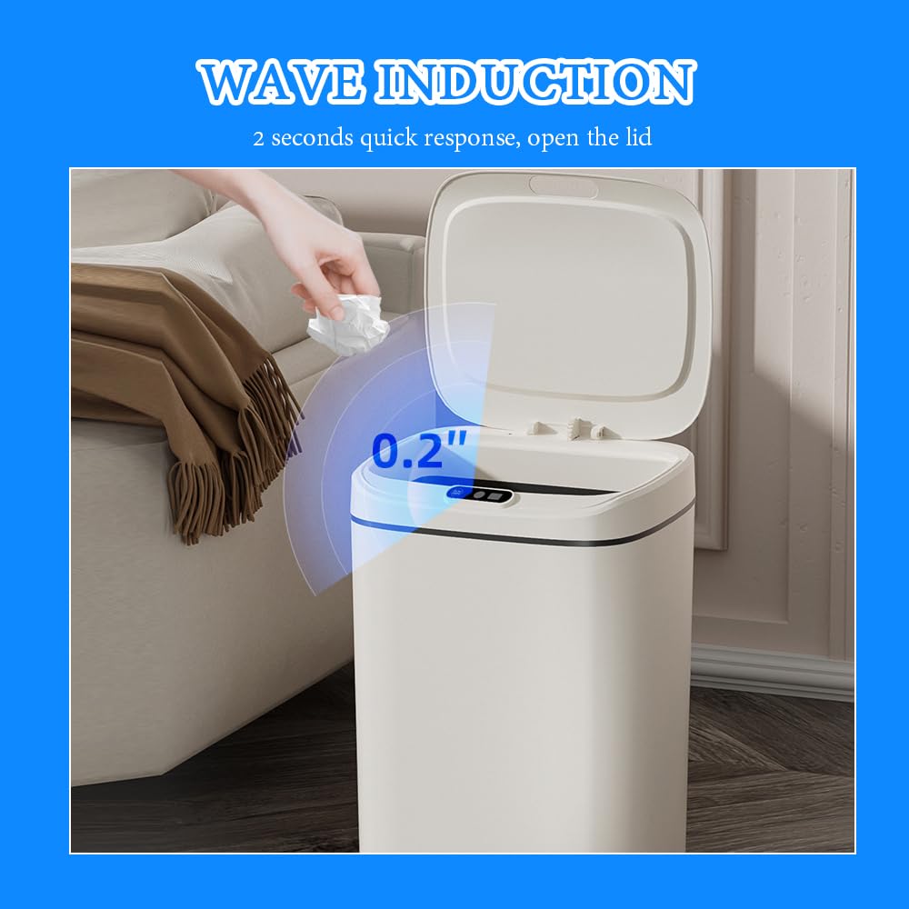 Smart Touchless Trash Can – The Perfect Solution for Home & OfficeUpgrade your space with our 3-mode automatic trash can, designed to blend seamlessly into any environment—whether as a small bathroom garbage can, office trash bin, or kitchen waste bin. Engineered for convenience and hygiene, this covered bathroom trash can combines smart technology with premium construction to elevate your daily routine.Key Features:3 Smart Operating ModesSensor Mode: Opens in 0.2 seconds when your hand approaches (6" range) and auto-closes after 6 seconds—ideal for hands-free use as a bathroom trash can white or kitchen garbage can.Foot Tap Mode: Lightly kick the base to open—perfect when your hands are full (great for small white trash can placement near sinks or desks).Lock-Open Mode: Hold the button for 2 seconds to keep the lid open during cleaning or parties—ideal for medium trash can use in high-traffic areas.Hidden Bag Storage – Never Run Out Mid-CleanupThe small garbage can with lid bathroom includes a discreet compartment that holds 5-7 extra trash bags, so you're always prepared. No more digging through drawers when replacing liners in your bathroom waste basket with lid or office trash cans for near desk.Silent Slow-Close Lid – Noise-Free OperationUnlike loud, slamming lids, our trash can bathroom with lid uses hydraulic dampening to close smoothly in 3 seconds at under 25dB—quieter than a whisper. Perfect as a waste basket for bedroom or office garbage cans for under desk where noise matters.Durable & Easy to Clean – Built to LastMade from 5mm reinforced PP plastic, this rectangle trash can supports up to 33 lbs (2x stronger than standard bins). The scratch-resistant matte finish repels stains—wipe away spills, ink, or grease with ease. Whether used as a bathroom garbage can with a lid or small office trash can, it stays looking new.Odor-Locking Seal & Long-Lasting BatteryAirtight silicone seal blocks 90% of odors—ideal for covered trash can bathroom use with food waste or diapers.Runs on just 2 AA batteries (not included) with 20-30 days of power—perfect for low-maintenance trash bin office or bathroom trashcans.Compact & Space-Saving (9.1"L x 7.9"W x 12.4"H) – Fits snugly as a small trash can for office, bathroom waste basket, or under-sink kitchen bin.Perfect For:Bathrooms: The white bathroom trash can with lid blends into modern decor while containing odors.Offices: A sleek trash can for office that won't disrupt meetings (near desks or in corners).Bedrooms/Dorms: The small white trash can keeps tissues and late-night snacks tidy.Kitchens: A medium trash can that handles daily scraps without constant bag changes.Why Choose Us?Hospitality-Grade Durability – Tested for 10,000+ lid cyclesEffortless Maintenance – Wipe-clean surfaces & bag retention ringDiscreet & Stylish – Matte white finish suits any decorUpgrade to a smarter, cleaner solution—get your automatic trash can today!
