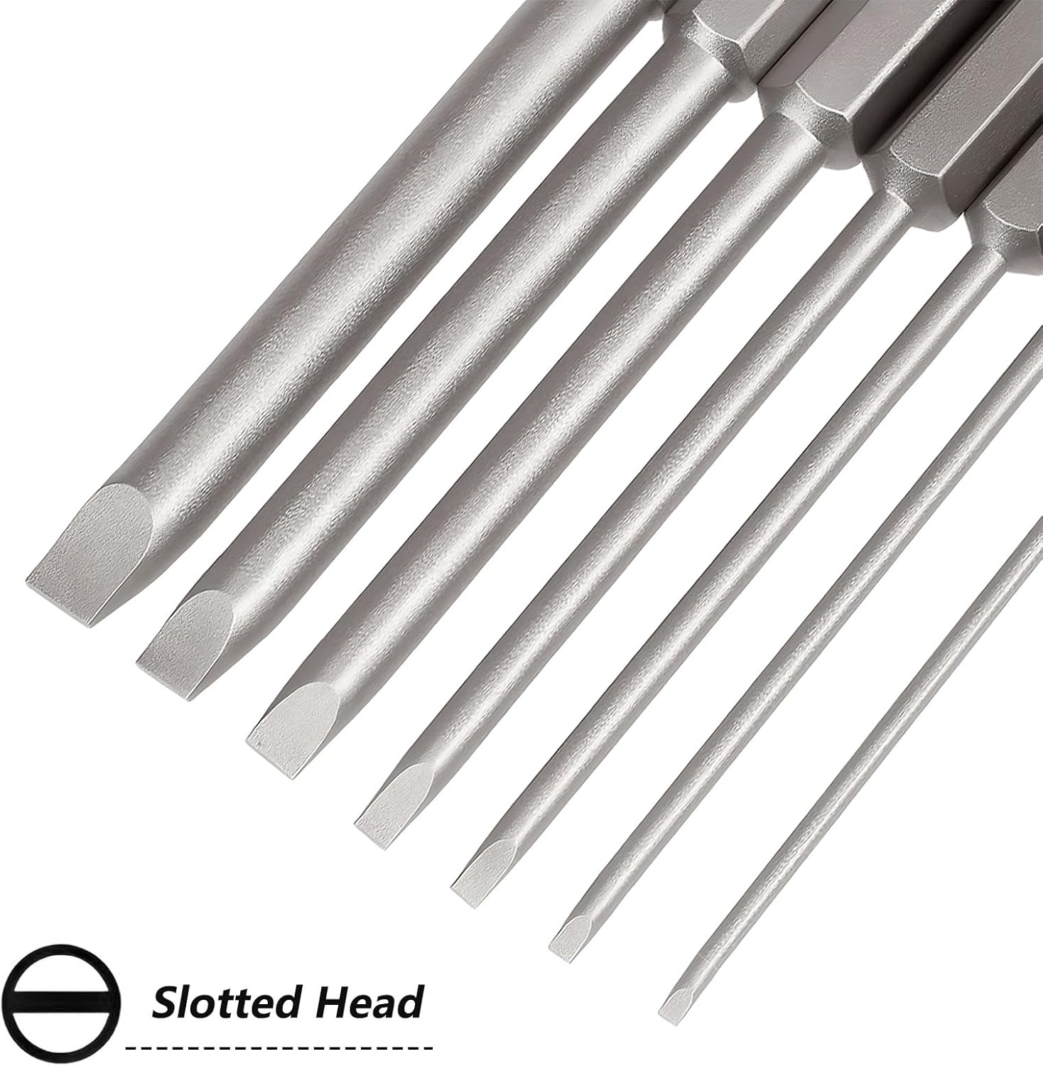 Features1. The flat head bits are made of high quality S2 alloy steel which is wear resistance and corrosion resistance to use long time2. Magnetic screwdriver bit set with strong magnetic to hold screws tightly and improve efficiency3. The torsional region absorbs the peak torque, which helps to absorb the high torque of the impact driver and avoid fracture. Extend service life.4.The 1/4" hex handle can be used with electric screwdrivers, hand screwdrivers, electric drills, combination general purpose tools.Specification:Material: S2 high quality steelShank: 1/4 inch(6.35mm)Length: 4 inch/ 100mmSize: SL2/SL2.5/SL3/SL4/SL5/SL6Type of head: Flat HeadQuantity: 6pcsPackage Included:6 x 1/4 Inch Hex Shank Magnetic Flat Head Screwdriver Bits Set