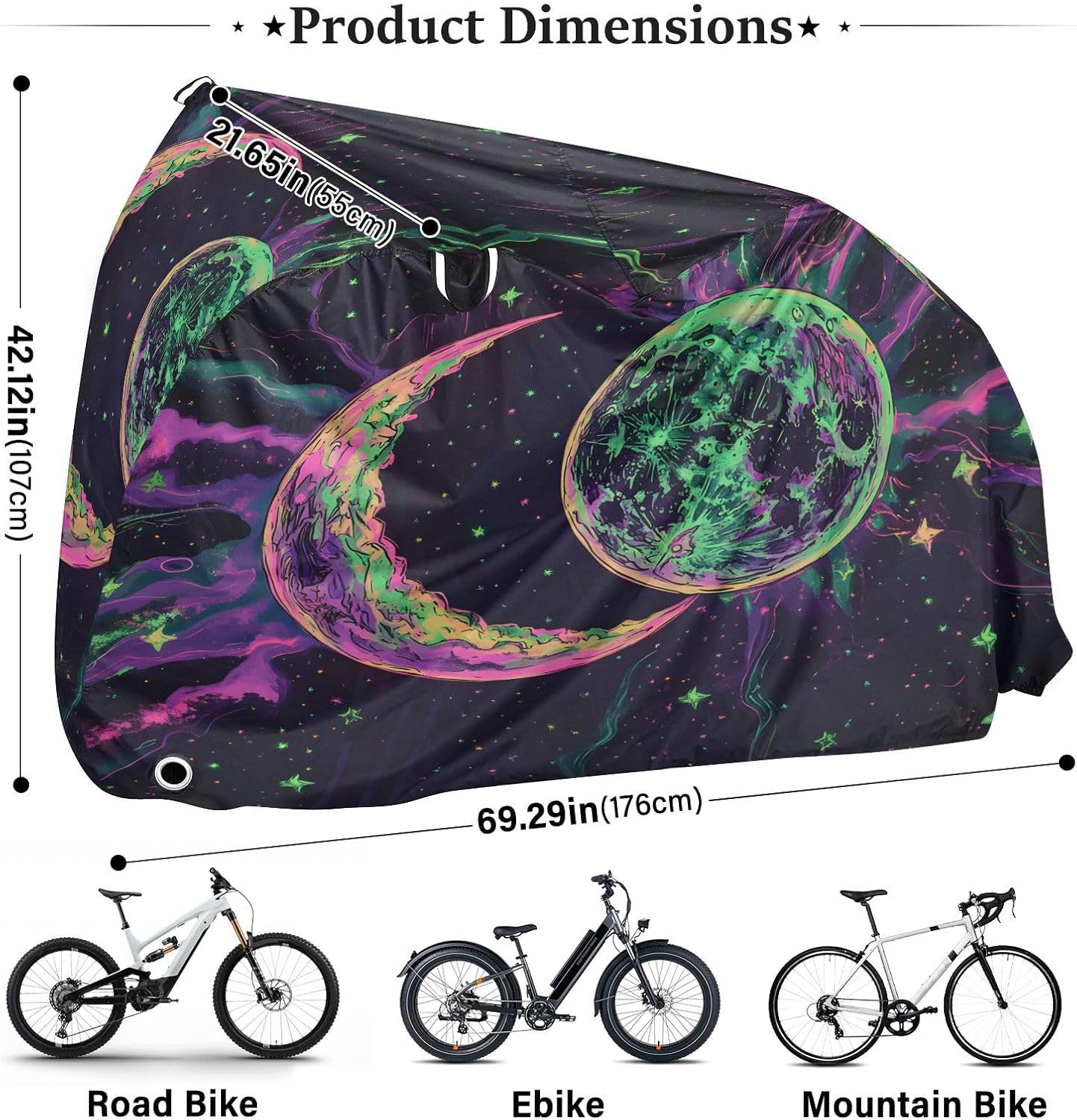 Protect your bicycle in style with our premium bike tarp, engineered for maximum defense against harsh elements. Unlike basic covers, we use specially engineered umbrella waterproof fabric - the same advanced material used in high-end rain umbrellas - delivering superior performance with unique visual appeal. Sun & Heat Defense Our fabric creates a physical cooling barrier that actively lowers your bike's temperature by: Blocking 95%+ harmful UV rays to prevent paint fading Providing exceptional shading & heat insulation (up to 20℉/11℃ reduction vs direct sun) Offering SPF 50+ equivalent protection for sensitive components Rain & Dust Protection Water-repellent coating causes rain to bead and roll off Tightly woven fabric acts as dustproof barrier for long-term storage Prevents moisture buildup with breathable side panels (prevents condensation) User-Focused Design LOCK ACCESS HOLE at front wheel enables secure locking without removing cover ADJUSTABLE BUCKLE STRAP at rear wheel anchors cover during strong winds Reflective safety strips on handles enhance nighttime visibility Ultra-lightweight (23 oz) folds into included pouch Unbeatable Aesthetics Choose from over 1,000 designer patterns - from sleek geometrics to vibrant nature motifs - transforming your bike into a street-style statement while competitors offer only solid colors.