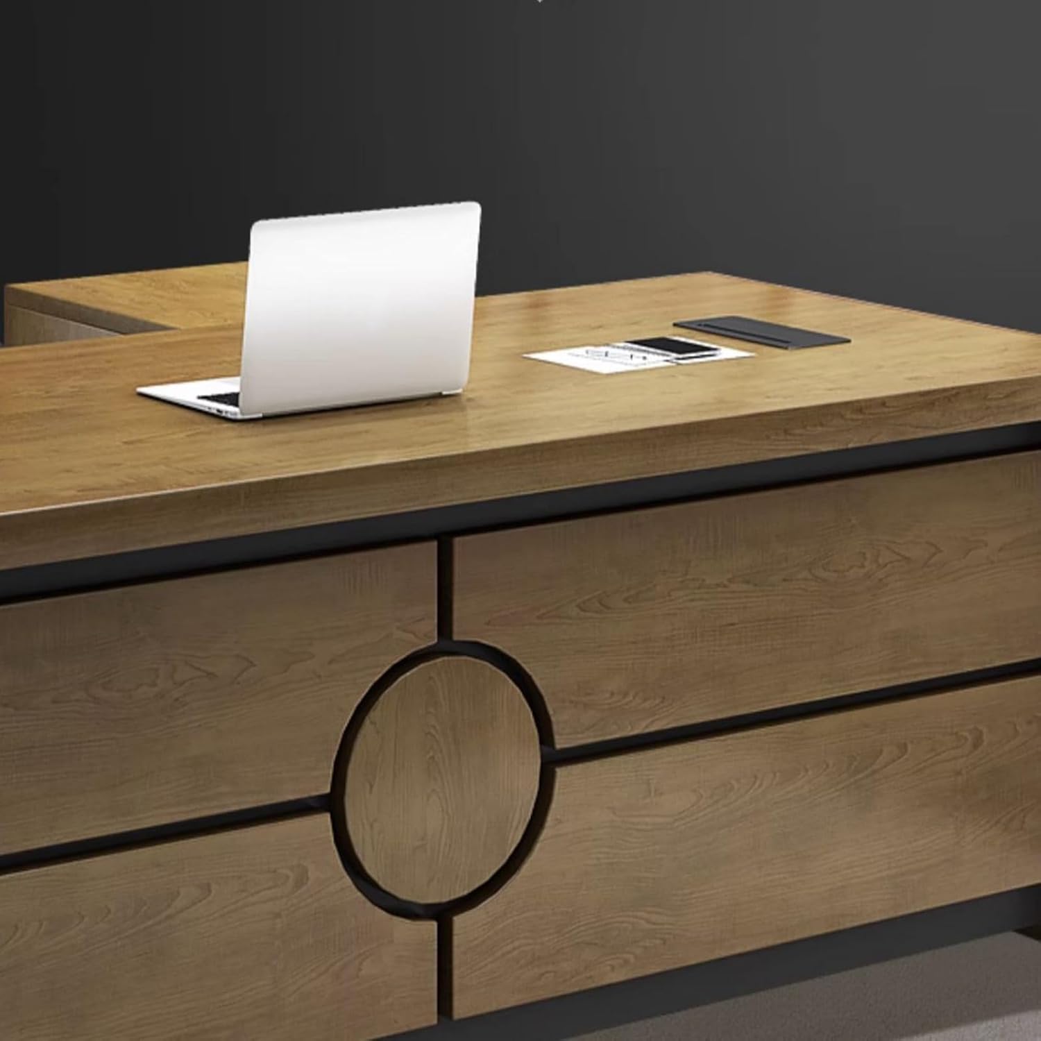 Product Dimensions: 79"L x 31" W x 29.5"HColor: BrownStyle: ModernBase Material: Wooden LegsTop Material Type: WoodFinish Type: WoodSpecial Feature: L-ShapedRoom Type: Office, Bedroom, Study RoomRecommended Uses for Product: WorkingPackage List:Executive Desk x1Installation Accessories x1