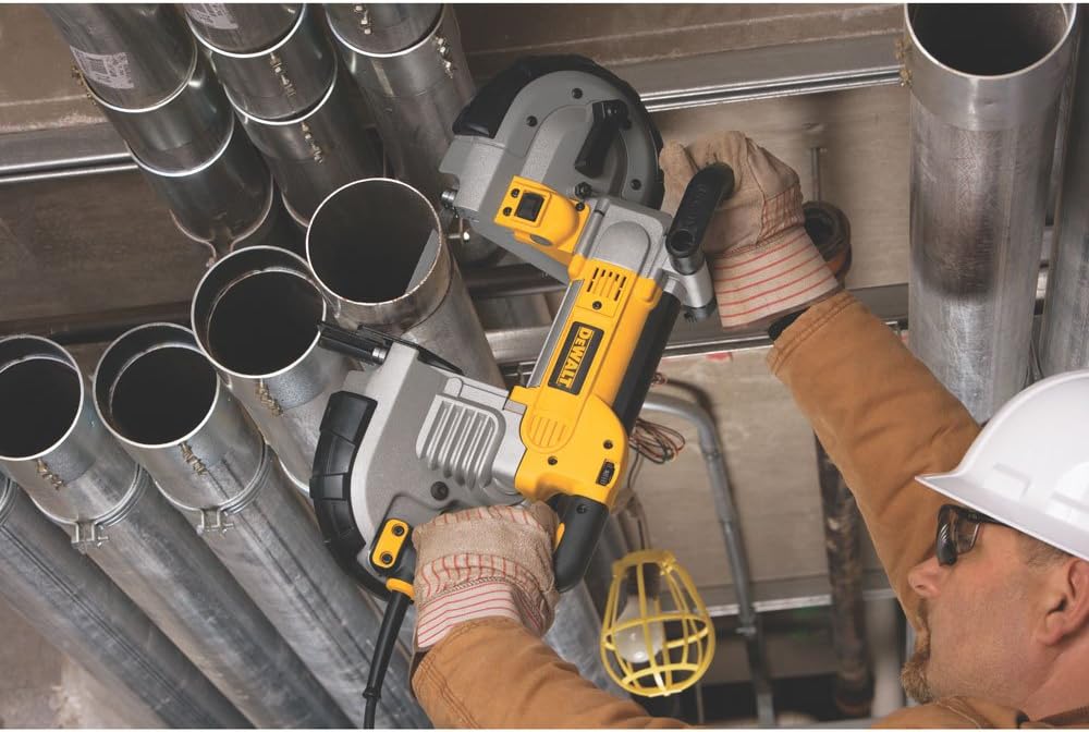 Product Description The DWM120K Deep Cut Band Saw Kit has a powerful 10 Amp motor for operating various jobsite applications and cutting rectangular stock up to 5 inches deep. Variable speed dial with the band saw blades allows user to vary speed for specific materials and various applications. Amazon.com Durable and versatile, the DEWALT Deep-Cut Portable Band Saw Kit features a powerful 10 amp motor with variable speed control for material-specific and application-specific cutting performance. Also offering an LED sight that indicates the cut line, ergonomic grip options, and an integrated hanging hook, this work-horse saw is packed with little details that make your life easier.Powerful Motor with Variable Speed ControlThanks to a 10 amp motor designed to withstand tough jobs, this portable band saw to make quick cuts without getting bogged down. It can perform at speeds ranging from 100 sfm to 350 sfm, and its variable-speed dial allows you to quickly and easily select the perfect speed for each application.This versatile deep-cut DEWALT saw offers a 5-inch capacity when working with round stock and 5 by 4-3/4-inch capacity when working with rectangular stock.Designed for Durability and ConvenienceA durable and adjustable material guide allows you to set the saw for optimal performance when working with a variety of materials, while a convenient LED sight light allows you to see the cutting area clearly, even in poorly lit environments.Other features that contribute to this saw's long life include an integrated hang hook that allows you to hang the saw without having to put it up and down. A serviceable steel shroud, and rubber bumpers that allow the saw's guards to withstand jobsite abuse.Increased Blade Life and Easy MaintenanceThis band saw's accurate blade tracking adjustment improves blade alignment and reduces wear, resulting in increased blade life, while dual bearing blade guide rollers increase durability in the blade support system for overall dependability. When it does come time to switch out your blade, the saw's blade changing lever loosens blade tension to make blade changes more convenient.In addition, this saw features externally replaceable brushes, which allow you to make quick repairs whenever and wherever you need to.Ergonomic Features for Comfort and AccuracyA comfortable grip is an integral part of any saw's performance. This band saw features an oversized, multi-position front handle that offers plenty of hand space and easy adjustability, so you can get a precise grip and achieve more accurate cuts. An ergonomic soft grip back handle and the saw's well balanced body also contribute to improved comfort and reduced user fatigue.This Deep-Cut Portable Band Saw comes with a DEWALT warranty package that includes a three-year limited warranty, a one-year free service contract, and a 90-day money back guarantee.What's in the BoxDWM120K DEWALT Deep-Cut Portable Band Saw, hex wrench, standard 44.875- by .500- by .020-inch blade, and kit box. P.when('A').execute(function(A) { A.on('a:expander:toggle_description:toggle:collapse', function(data) { window.scroll(0, data.expander.$expander[0].offsetTop-100); }); }); From the Manufacturer Deep Cut Portable Band Saw Kit, Speeds 100-350. Surface Ft per Min Low 100, Surface Ft per Min High 350, Voltage 120, Hz 60, Amps AC 10. Drive Worm Gear And Chain, Rectangle Capacity 5 X 4 3/4 In, Round Capacity 5 In, Handle Design Ergonomic, Soft Grip, Blade Size 44 7/8 X 1/2 X 0.020 In, Bearings Ball And Roller Standards UL, Includes Hex Wrench, Blade And Carry Case. See more