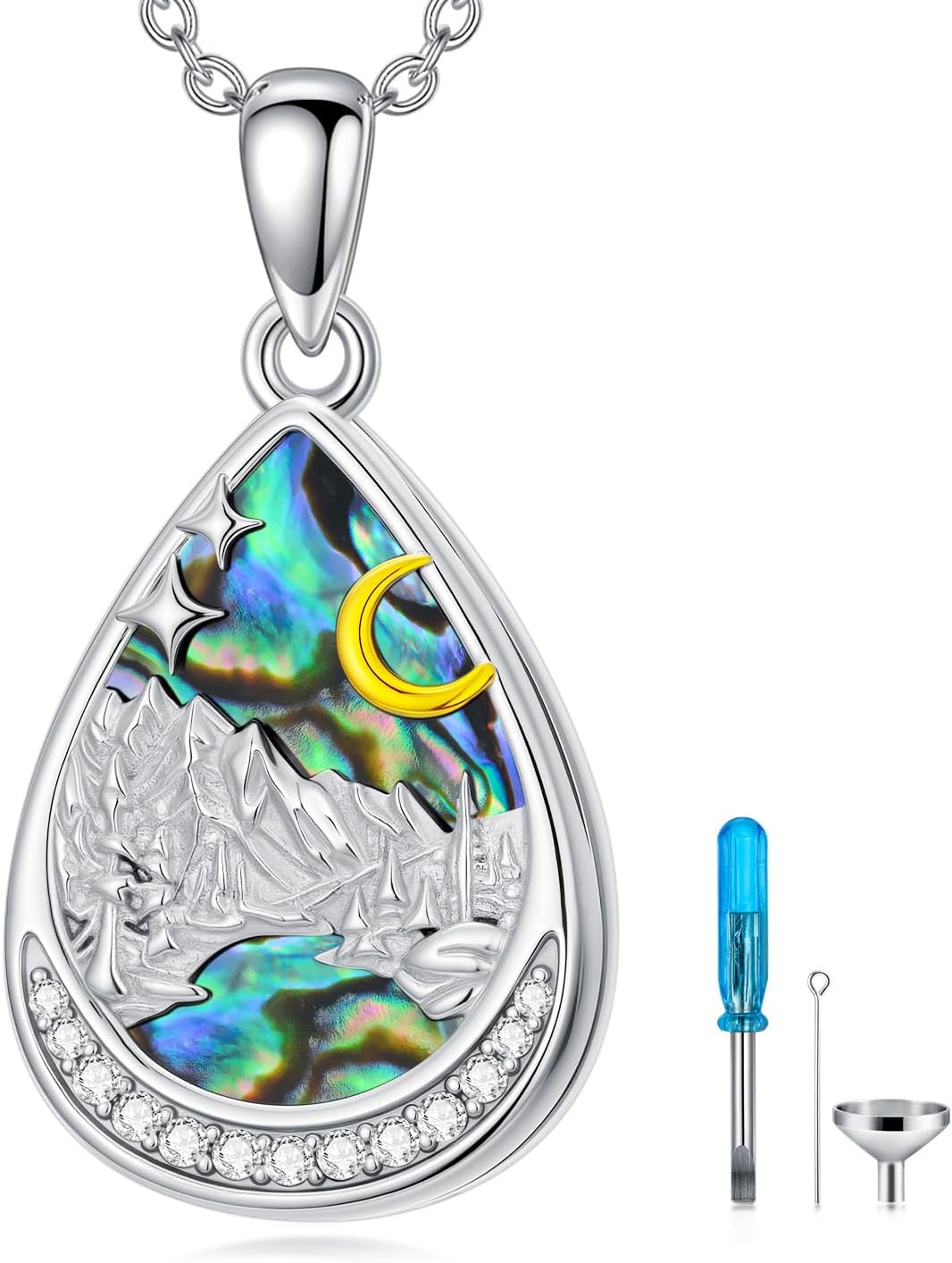 The "Mountain & Moonlit Sky" Urn Necklace-A tranquil landscape under a moonlit sky, a timeless haven for cherished memories. This Sterling Silver Urn Necklace tells a profound story of “eternal peace and guiding light.” Encased within a teardrop-shaped sterling silver frame, a vibrant abalone shell, swirling with the iridescent hues of life’s journey, serves as the canvas for a serene nightscape. Majestic mountains rise, symbolizing unwavering strength and an enduring spirit, while ancient pines stand sentinel, embodying everlasting life. A tranquil lake reflects the celestial embrace of two twinkling stars and a radiant golden crescent moon, representing the guiding presence and infinite love that lights even the darkest nights. As a profoundly symbolic cremation jewelry piece, this 925 ashes pendant is designed to hold the sacred memory of a loved one, transforming sorrow into a beautiful, wearable tribute that keeps their essence close to your heart.