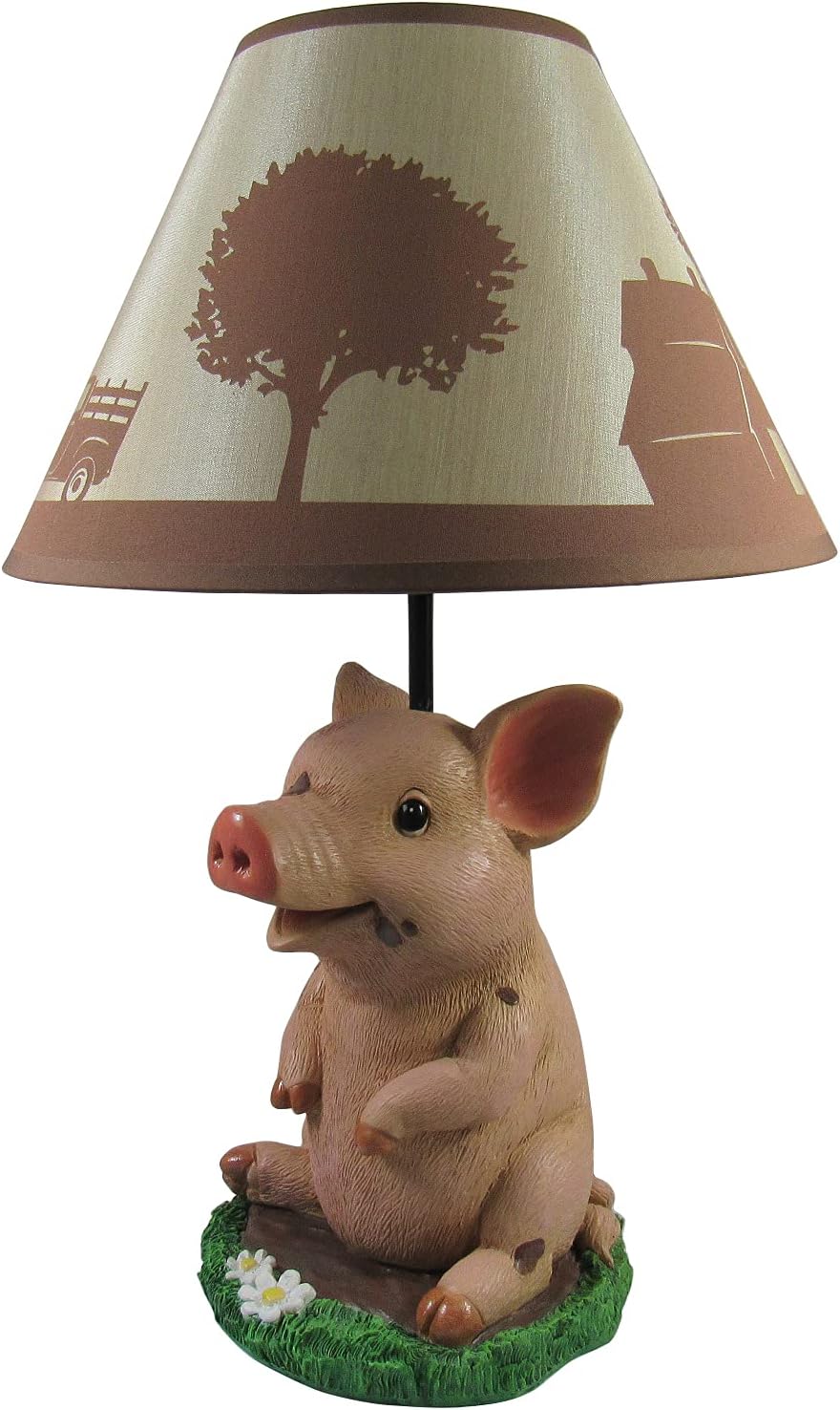 Featuring an adorable piglet wallowing in a mudhole, this sculptural table lamp is a wonderful accent in country farmhouse-themed rooms. This 18.25-inch tall, 8-inch diameter wide piglet lamp is expertly cast in resin with a highly detailed hand-painted finish and includes a 9-inch high, 12-inch diameter barnyard silhouette printed fabric shade. This lamp uses 1 Type A, 40-watt maximum bulb (not included) that is easy to turn on or off using the in-line rocker switch on the 53-inch long cord. This decorative lamp makes a great gift for pig lovers and is sure to be admired!