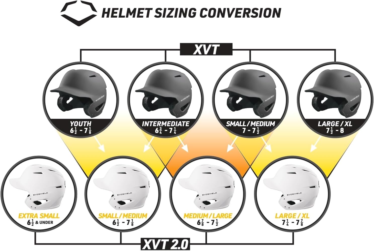Redesigned for supreme comfort and top-tier protection at the plate, the XVT 2.0 Batting Helmet by EvoShield ensures batters' safety in the box. Equipped with smooth, compression-molded pads, it's optimized to safeguard against high and tight pitches. The XVT 2.0 Batting Helmet boasts a low-profile shell, fully wrapped ear pads, and strategically placed vents for enhanced comfort, allowing batters to stay cool under pressure. Engineered with two ear flaps for use on both sides of the plate, the XVT 2.0 Batting Helmet meets SEI-certified NOCSAE protection standards.