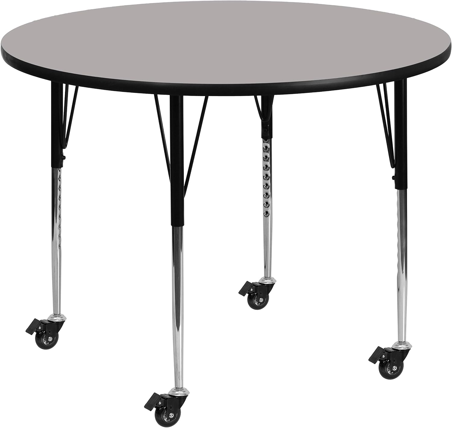 The Round Activity Table is a versatile option for school classrooms, corporate training centers and your home. Enhance collaborative learning by grouping tables together. It will accommodate children of all ages, from 1st grade to adult. It features a 48" high pressure scratch, stain and warp resistant laminate top with a black edge band and 16 gauge tubular steel legs for increased stability. The top incorporates a protective underside backing sheet to prevent moisture absorption and warping. An attractive black powder coated finish protects the upper legs from scratches and height adjustable chrome lower legs give you the flexibility to raise or lower the table a full 9" in 1" increments. Casters allow you to easily move the table around and then lock into place. This activity table provides a durable work surface for anything from computer labs to project meetings to laying out fabric in your sewing room.