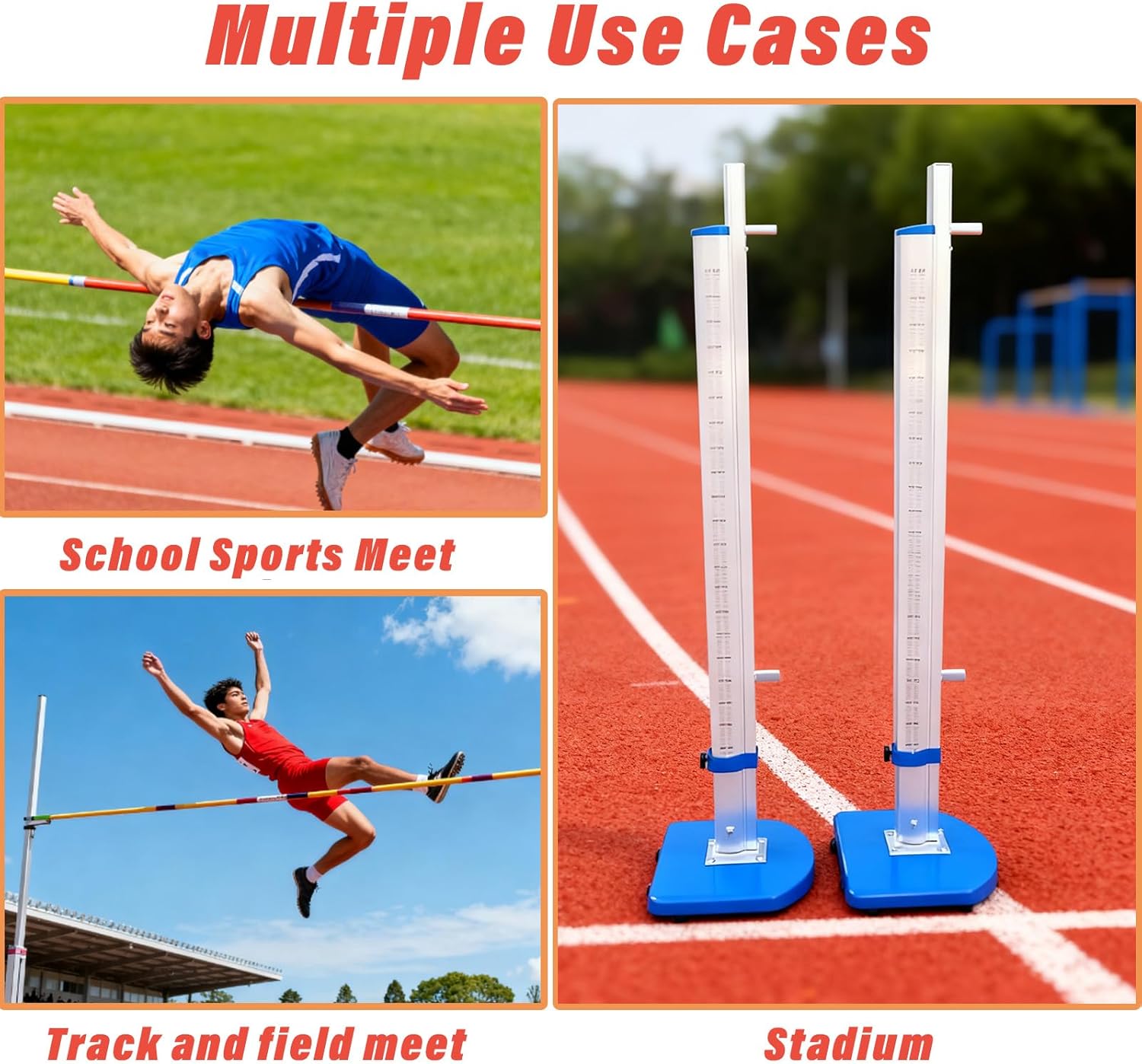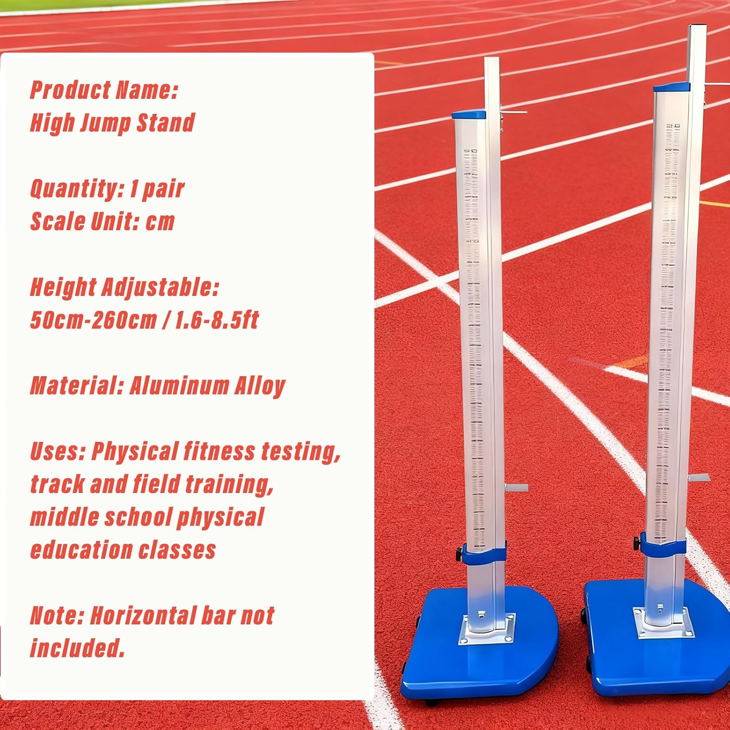 Product SpecificationsScale: Metric (cm)Upright Material: Aluminum AlloyBase Material: Aluminum AlloyBase Dimensions: 33 x 40 cm (12.9 x 15.7 inches)Height Adjustable: 50-260 cm / 1.6-8.5 ftProduct FeaturesSuitable for Different Levels:This high jump training stand is designed for student training, school team competitions, and professional events.It fully meets all high jump training needs from beginner to advanced levels.Strong and Durable:Made of durable aluminum alloy and iron, it can withstand various weather conditions and is long-lasting.Precise Adjustment:Height is easily adjustable between 50-260 cm / 1-7.5 ft.The scale is metric (cm) to meet various training needs.Easy to Move:Simple product structure, easy to install.The base is equipped with 2 smooth wheels for quick and easy movement and redeployment around the training area.Notes: Manual measurement may have an error of 1-2 cm. Please refer to the actual product.Due to factors such as monitor display and lighting, the actual color may differ slightly from the picture.Package List:1 x One pair of uprights (crossbar not included)