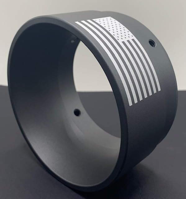 "Basic-F" Replacement End Cap / Exhaust Muffler Tip fits on 4.5" Khrome Werks slip on exhaust system for a Harley Davidson motorcycle. Cerakote ceramic finish that can withstand 1800 Fahrenheit. Laser engraved American flag. One flag centered on a threaded hole. Billet aluminum machined, coated and engraved in the USA. Hardware (bolts) not included.