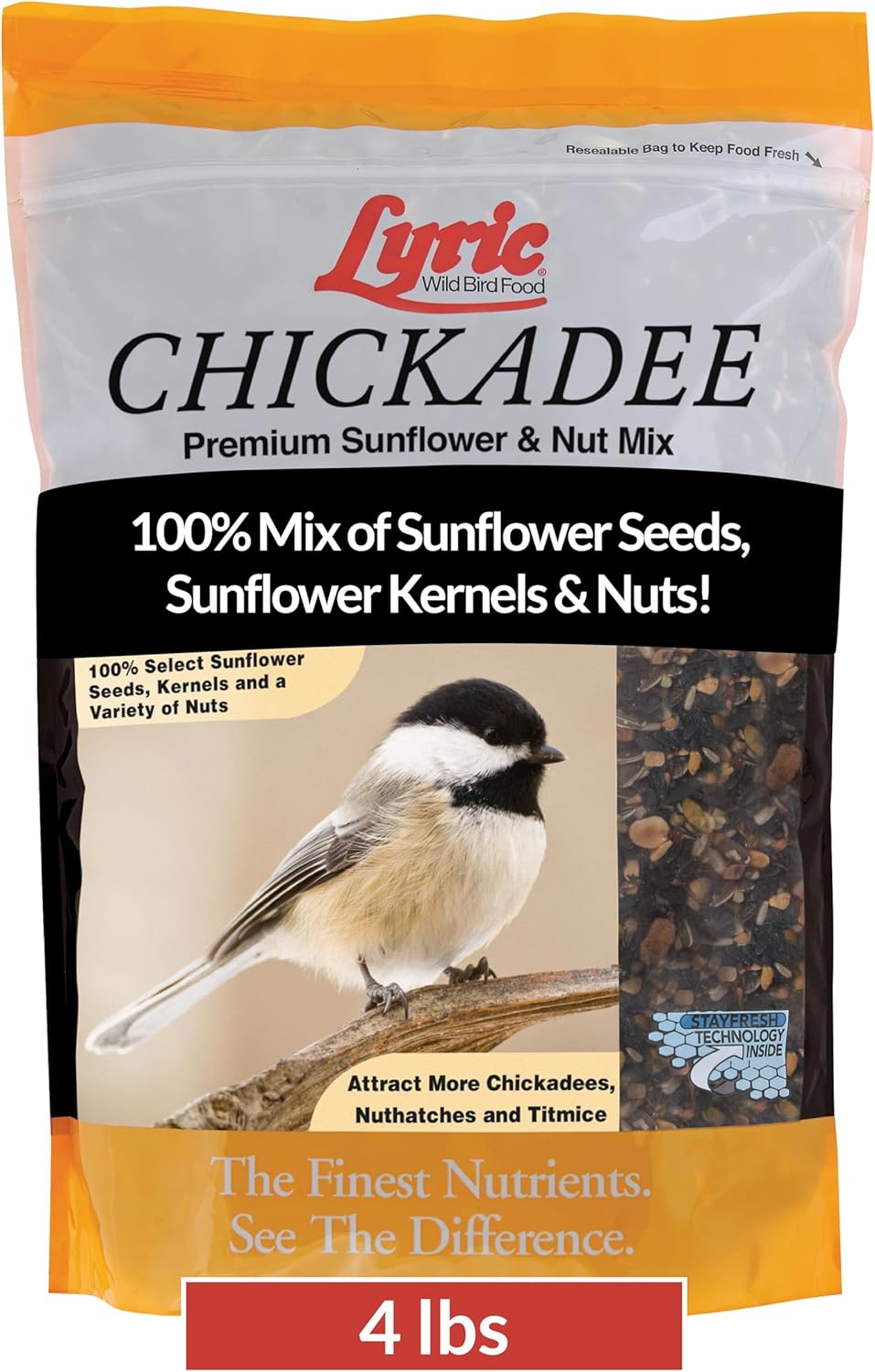 Lyric Chickadee Sunflower and Nut Mix is the perfect treat for your feathered friends visiting your backyard bird feeders. This premium wild bird seed mix features 100% sunflower seeds and nuts, such as sunflower kernels, peanuts, pecans, and pistachios. Designed to fuel birds' high daily activity, whether foraging in winter or building nests in spring, it provides ideal birdfood. Lyric Chickadee Sunflower and Nut Mix is suitable for hanging bowl-style feeders and tube feeders. Chickadees spend most of their time in trees, so placing outdoor bird feeders on tree branches increases visitors. Enjoy wild bird feed by placing it in your favorite feeders and watch as it attracts songbirds like bluebirds, chickadees, jays, nuthatches, titmice, woodpeckers, wrens, and more. Whether you use shelled sunflower seeds for birds or a songbird bird seed, this mix enhances backyard bird feeding. This bird seed sunflower mix promotes bird feeding and is ideal for those seeking birdseed for wild birds.