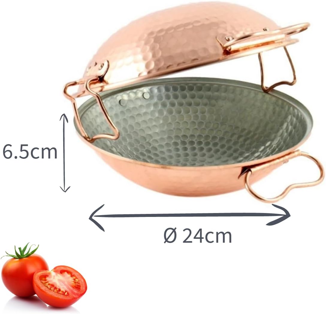 Cataplana is a typical cooking utensil of Portuguese cuisine from the Algarve region. Composed of 2 copper half-spheres closed by a hinge, it delivers steam cooking that retains all the taste properties and vitamins of food. Ideal for many recipes based on fish, seafood, meat, vegetables... Its hammered copper finish made in a handmade way gives it a very beautiful line as well as great solidity. Its interior is tinned. The copper cataplana is suitable for all hobs EXCEPT induction and is oven safe up to 280°C. It requires precise maintenance, read the precautions for use below. Dimensions when closed: 55 x 33 x height 6.5 cm. Made in Portugal.