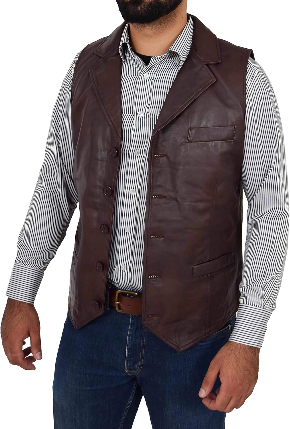 This waistcoat for men's is made from genuine sheep nappa leather which is fully lined inside with polyester. It features five front button closure, three front pockets and an adjustable strap on the back to refine the fit.