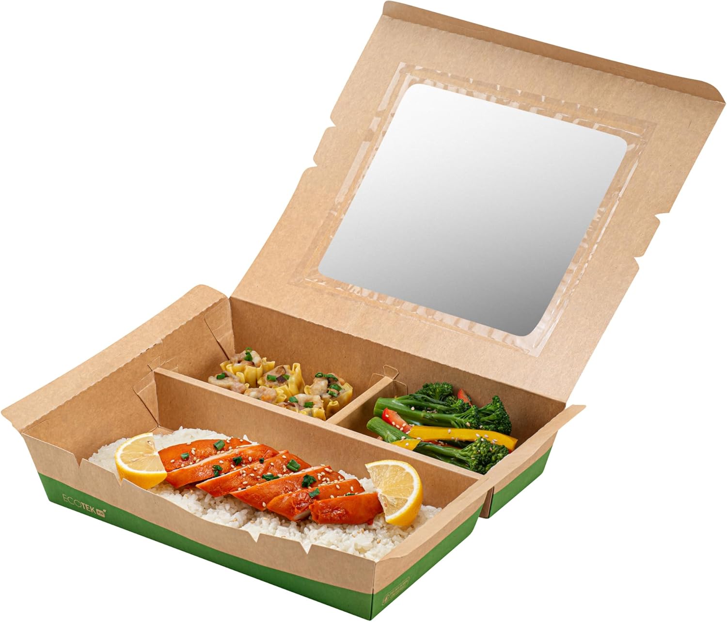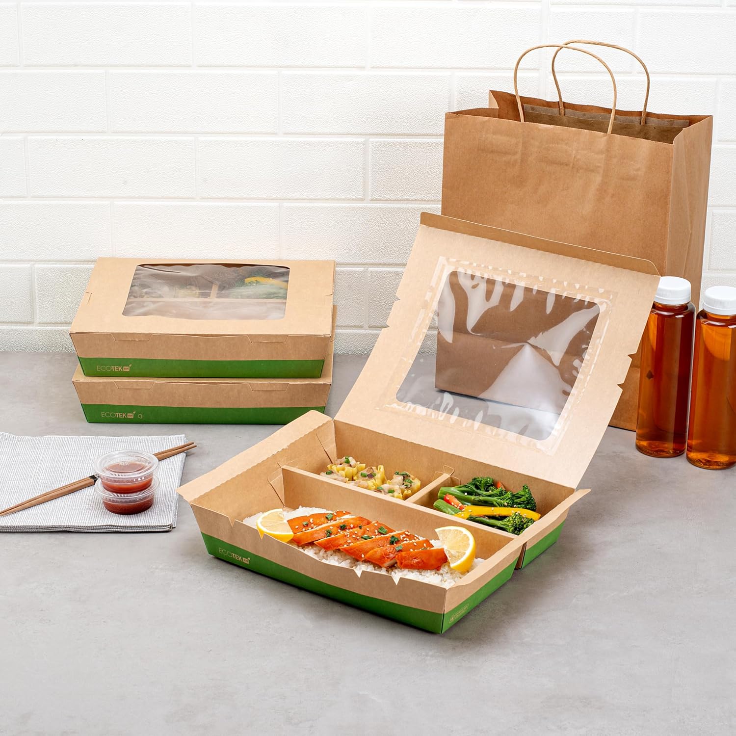 Streamline your meal service with organized and sustainable packaging. The Eco Tek 3 Compartment Bento Box features a transparent PLA window that allows for quick meal identification, enhancing efficiency during busy service hours. With three distinct compartments, this kraft lunch box facilitates organized storage of a variety of dishes, ensuring meals remain neatly separated and visually appealing. Made from paper, this bento box supports eco-conscious disposal, aligning with sustainable foodservice operations and reducing environmental impact. Measuring 11 inches in length, 9 inches in width, and 2 inches in height, these boxes offer ample capacity for portion control and diverse meal offerings. Elevate your food presentation and service with this reliable and eco-conscious solution. Each order includes 100 Eco Tek 3 Compartment Bento Box.