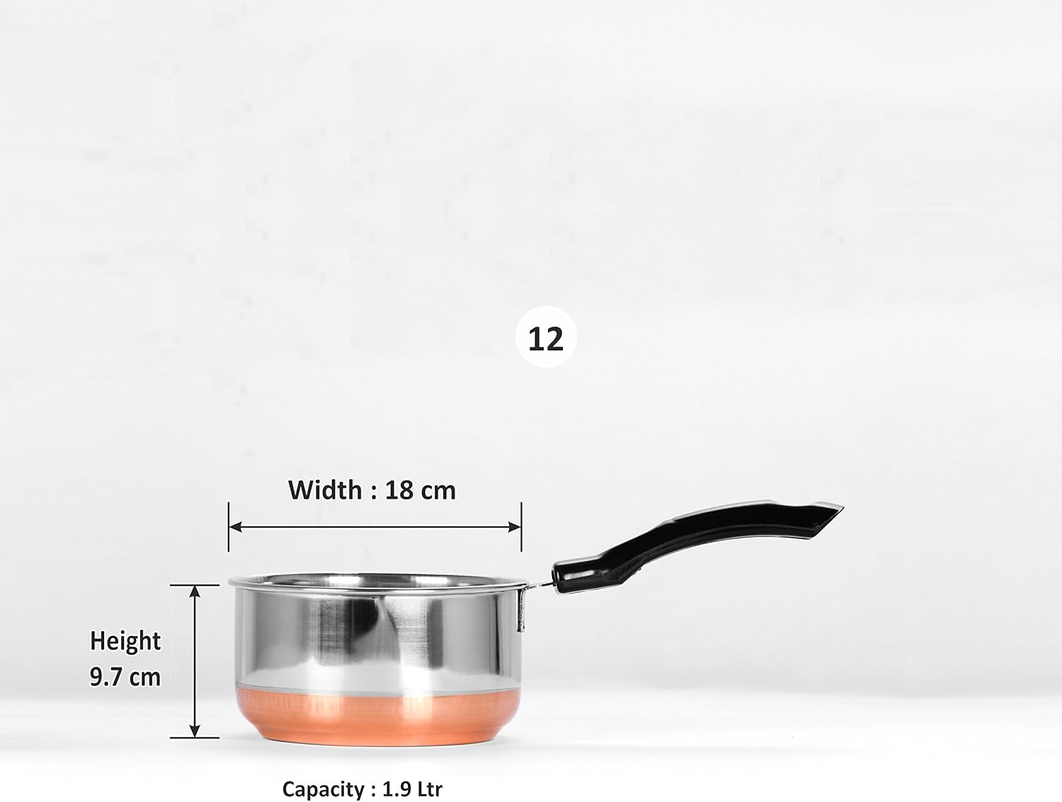 Cook in style with this Elegant Design Mirror Finish Copper Bottom Stainless Steel Multipurpose Saucepan from Sumeet Features: « Deep vessel pan useful for making any kind of food. « Useful for cooking food on Gas stove. Not induction fiendly. « Copper bottom cookware « Energy Efficient, heats evenly and cooks faster « Made with high quality mirror finish stainless steel. Food will not stick to your pan. « Comes with a plastic handle that makes your work easy and fast. « Easy to maintain & clean « Sausepan with out lid. Specifications: Material: Export Quality Mirror Polish Stainless Steel Copper Bottom Saucepan making it ideal for daily use, highly durable & long lasting. Size: 12 Dimension - L X W X H (cms): 18 X 18 X 9.7 Capacity - 1.9 L Weight - 0.5 Kgs Package Contains: 1 Saucepan with handle