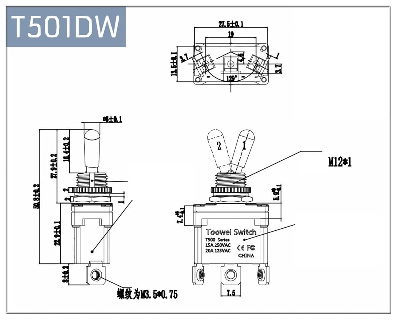 T500 series water proof Toggle switch IP67/outdoor switch/T501DW 3 pins ON-(ON) momentary switch 15A 250V