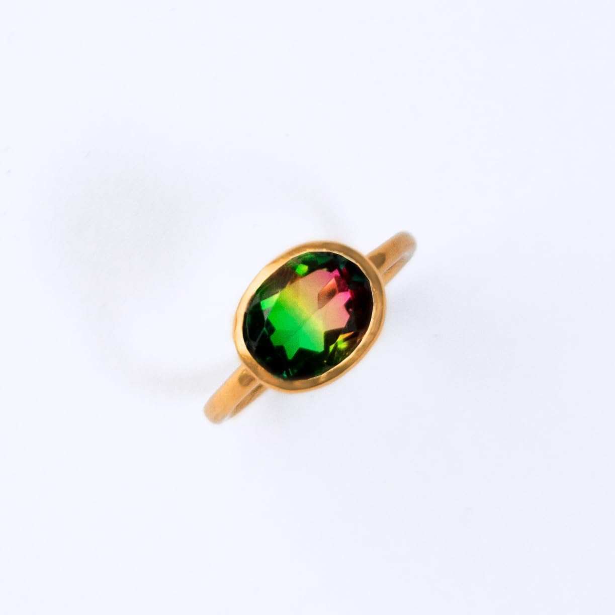 You'll fall in love with the green, yellow and pink color of this Tricolor Watermelon Tourmaline Quartz ring. This is a perfectly sized oval to compliment any collection. Popular as a birthday, Mother's Day, or Christmas gift. This is a vibrant, transparent multicolor gemstone with no flaws. This stone is beautifully faceted and bezel set in a 925 sterling silver band or plated with 18k vermeil gold. This ring is great for stacking and we have it along with other ring designs available in a variety of stones. Please take a look at our store.
