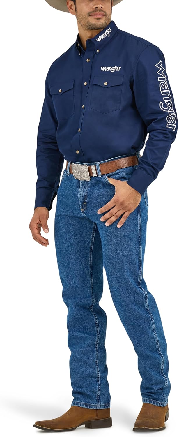 Logo loyalty. Get the look of champions with your choice of these logo-styled shirts. Some feature only the Wrangler logo. Others feature the Wrangler logo and either the ford or Pendleton whiskey logo the left pocket and on the back yoke. Style details include embroidery on the yokes and snap flap western pockets.