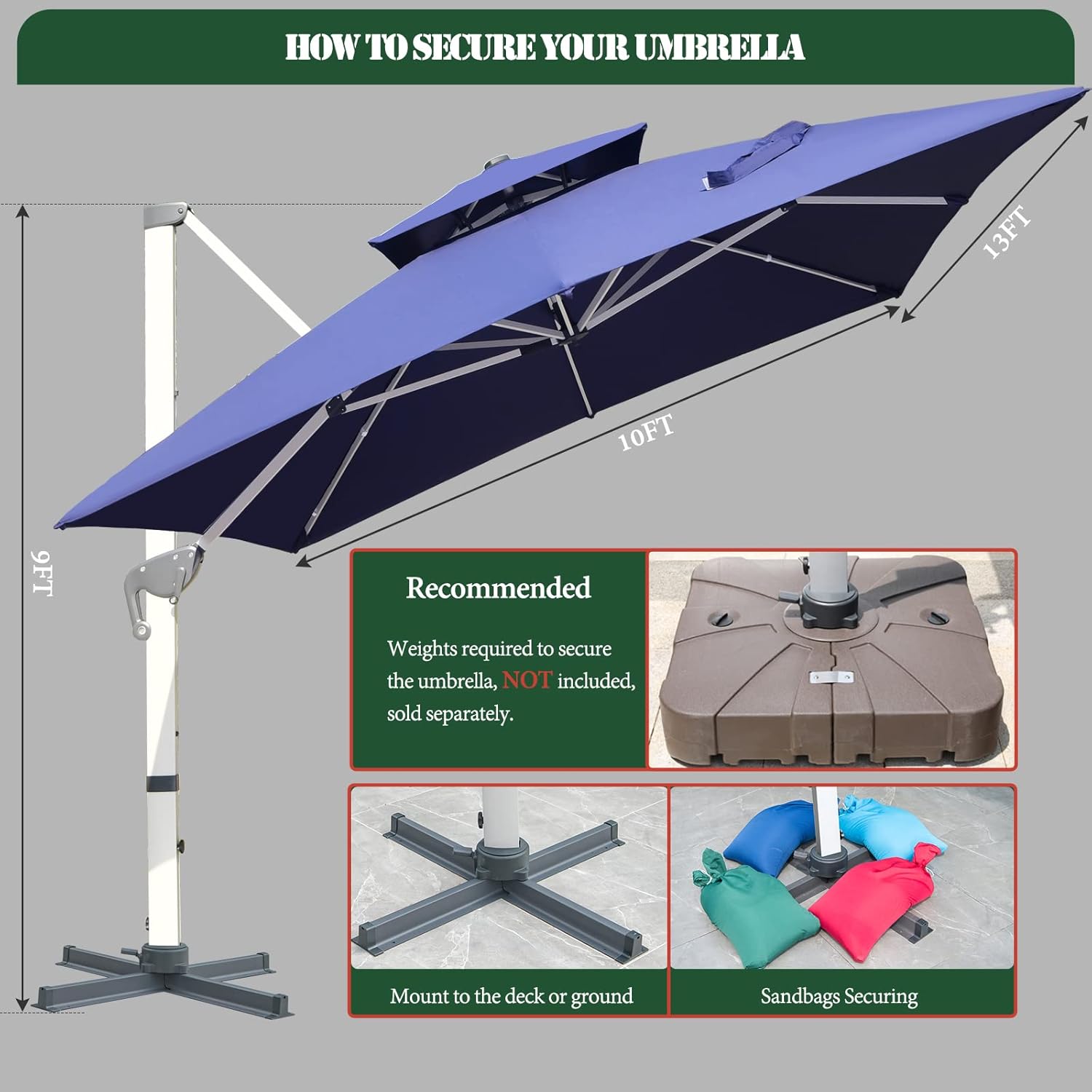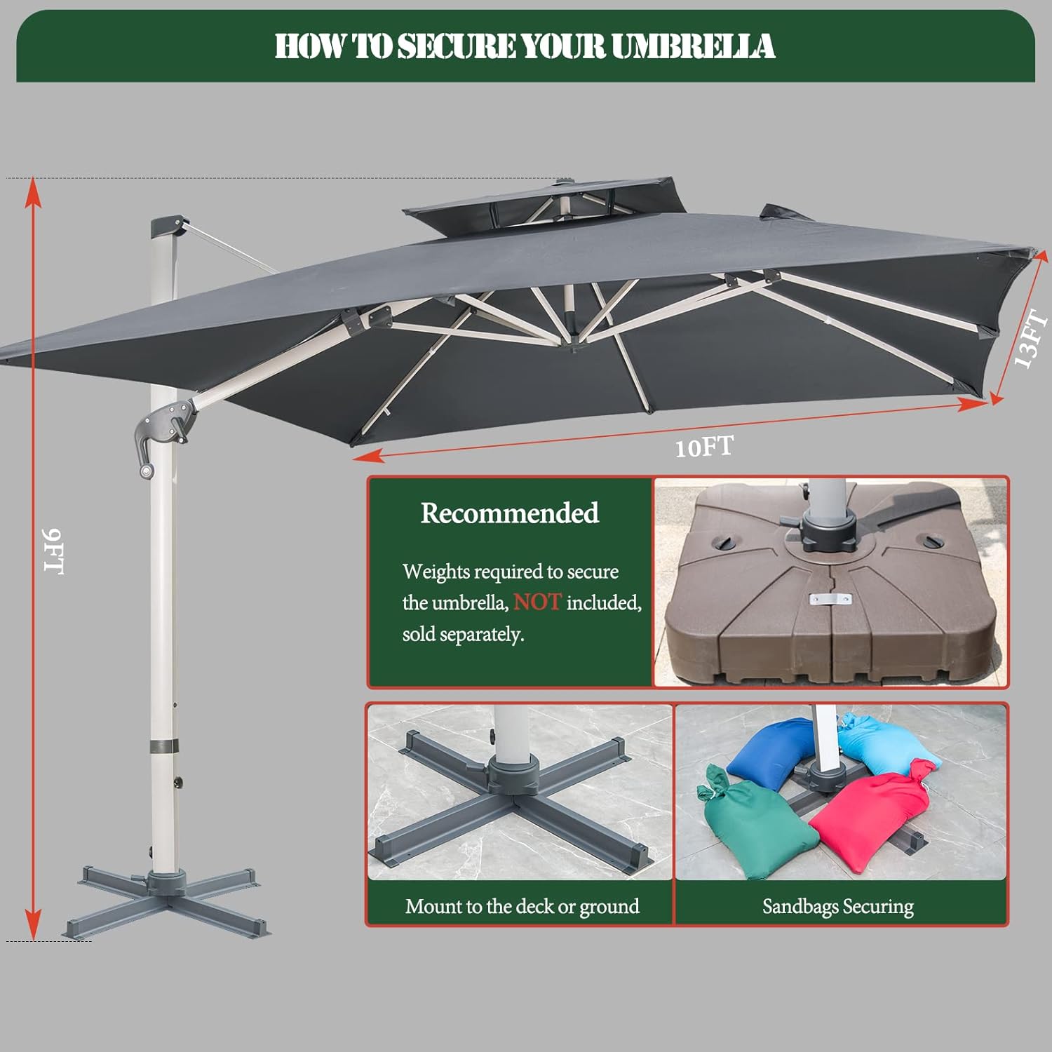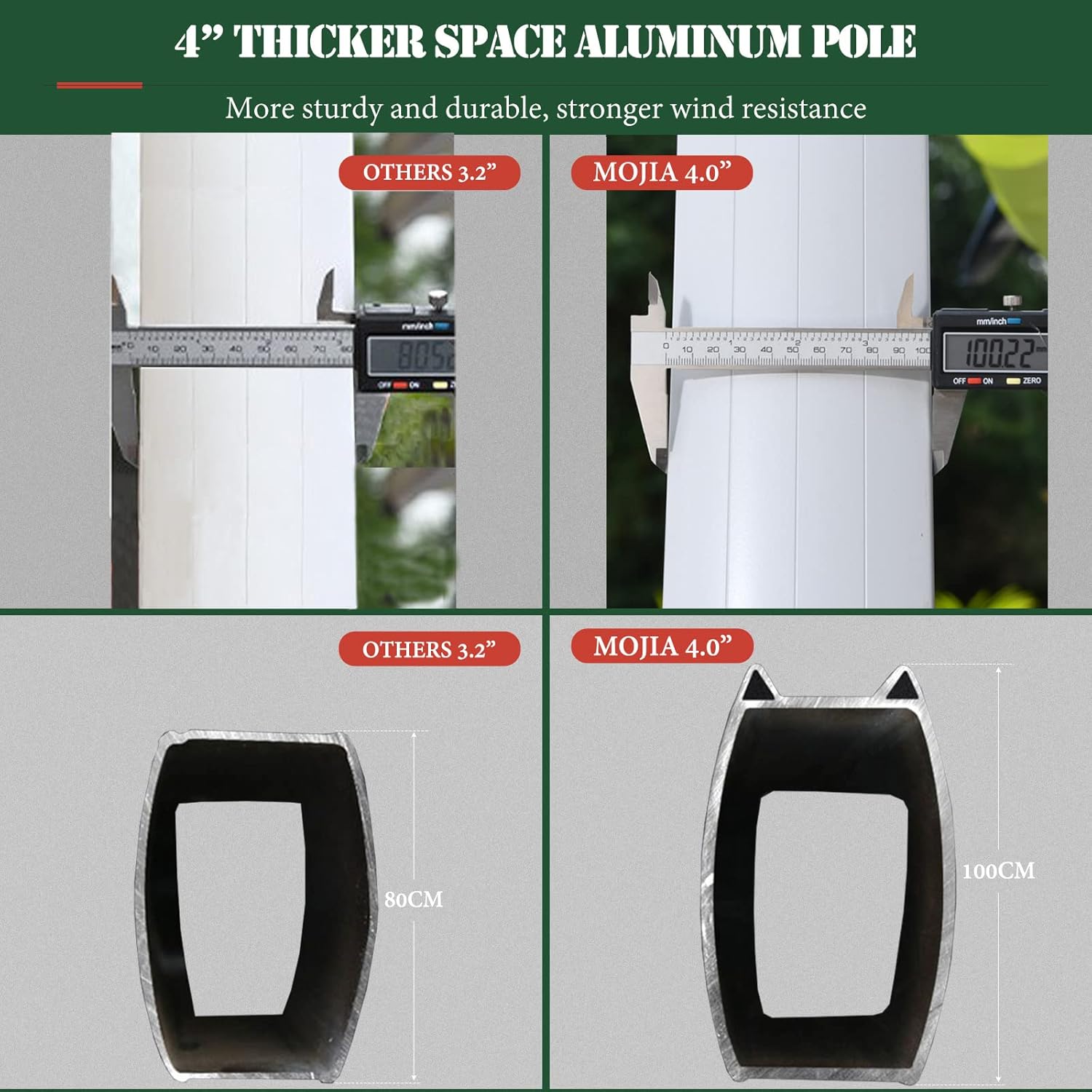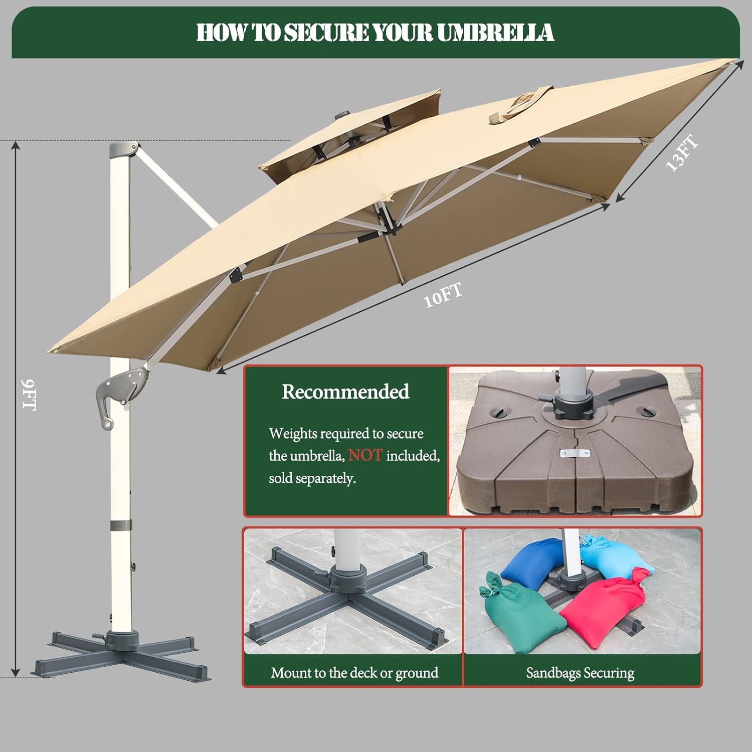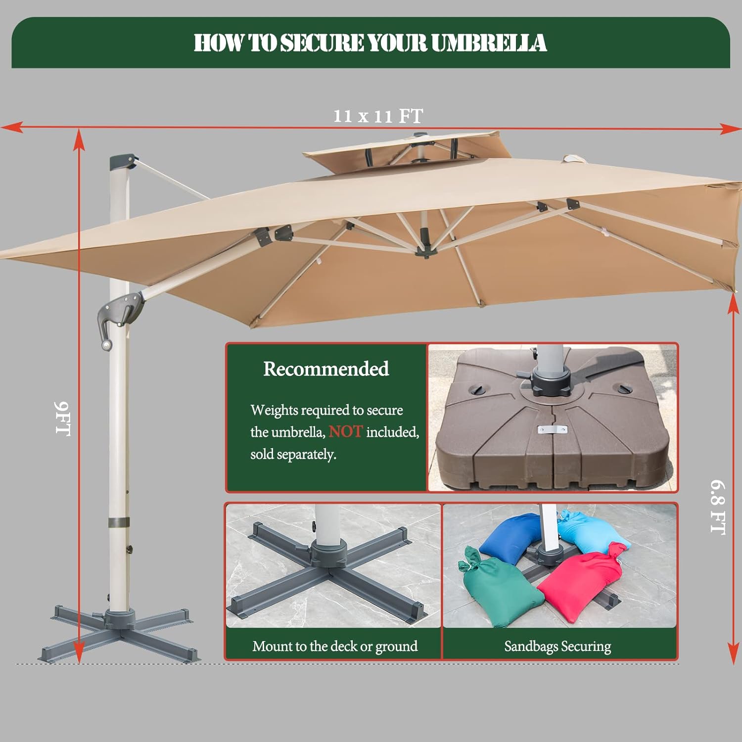 | Special Features | Sturdy Aluminum Pole, Steel Ribs, Double-layered Canopy with Ventilation, Solar-powered LED Lights, 360-degree Rotation, Adjustable Incline System |