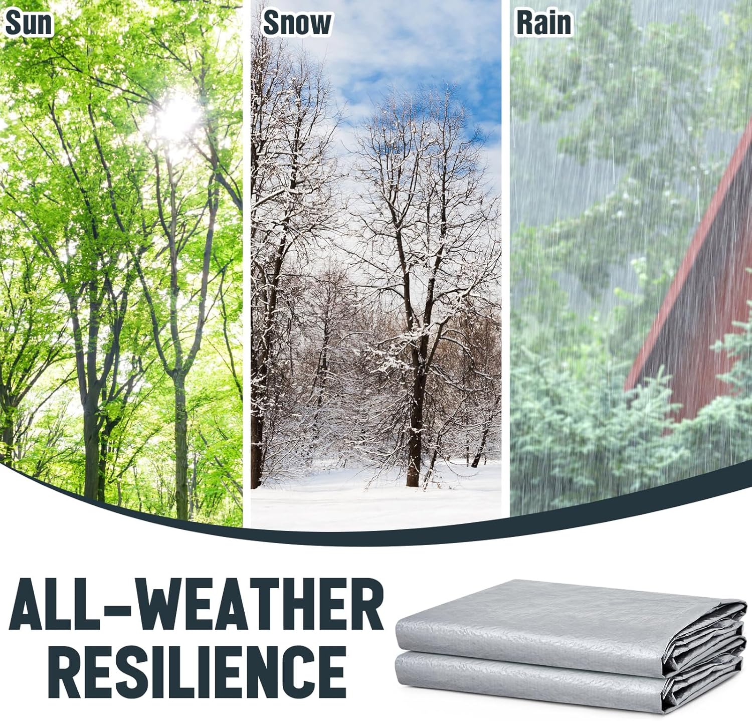 Features: Exceptional durability: Our outdoor tarp is designed to last. Its durability is amplified by the PE material and its nature of being a heavy duty tarp. Part of its charm is its perseverance and toughness, making it stand out among tarps. Functional features: This waterproof tarp comes with an essential feature of being versatile. From emergency shelter to a lightweight yet heavy duty tarpaulin, this product offers multiple uses. Specifications: Material: PE material Color: silver Size: 3.04 x 6.08 M/ 10 x 20 feet Package includes: 2 x Waterproof tarps Notes: Manual measurement, please allow slight errors on size. The color may exist a slight difference due to different screen displays. Please note that the size label on the product does not need to be removed, it will not affect the use, and avoid violent tearing to damage the product