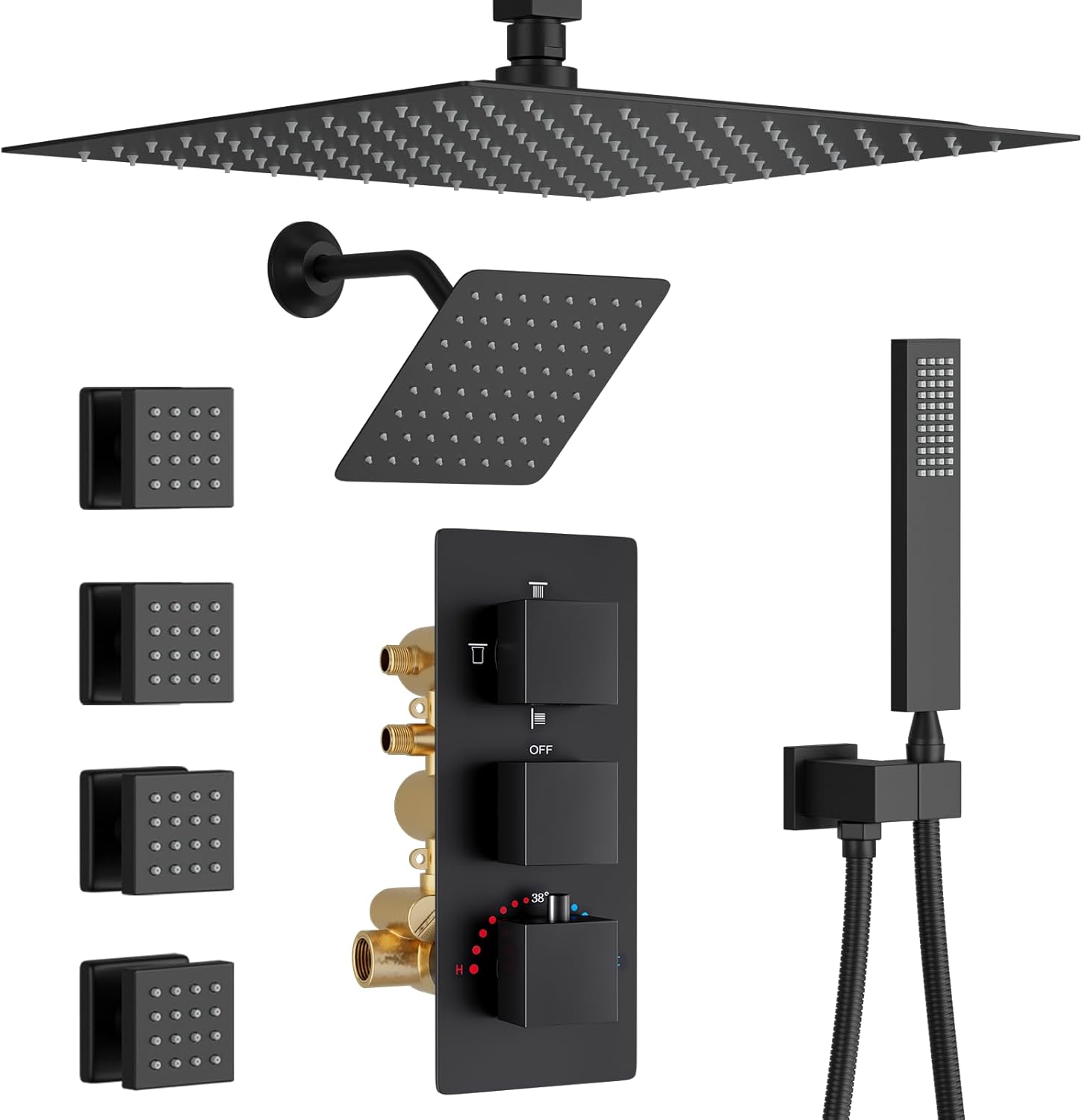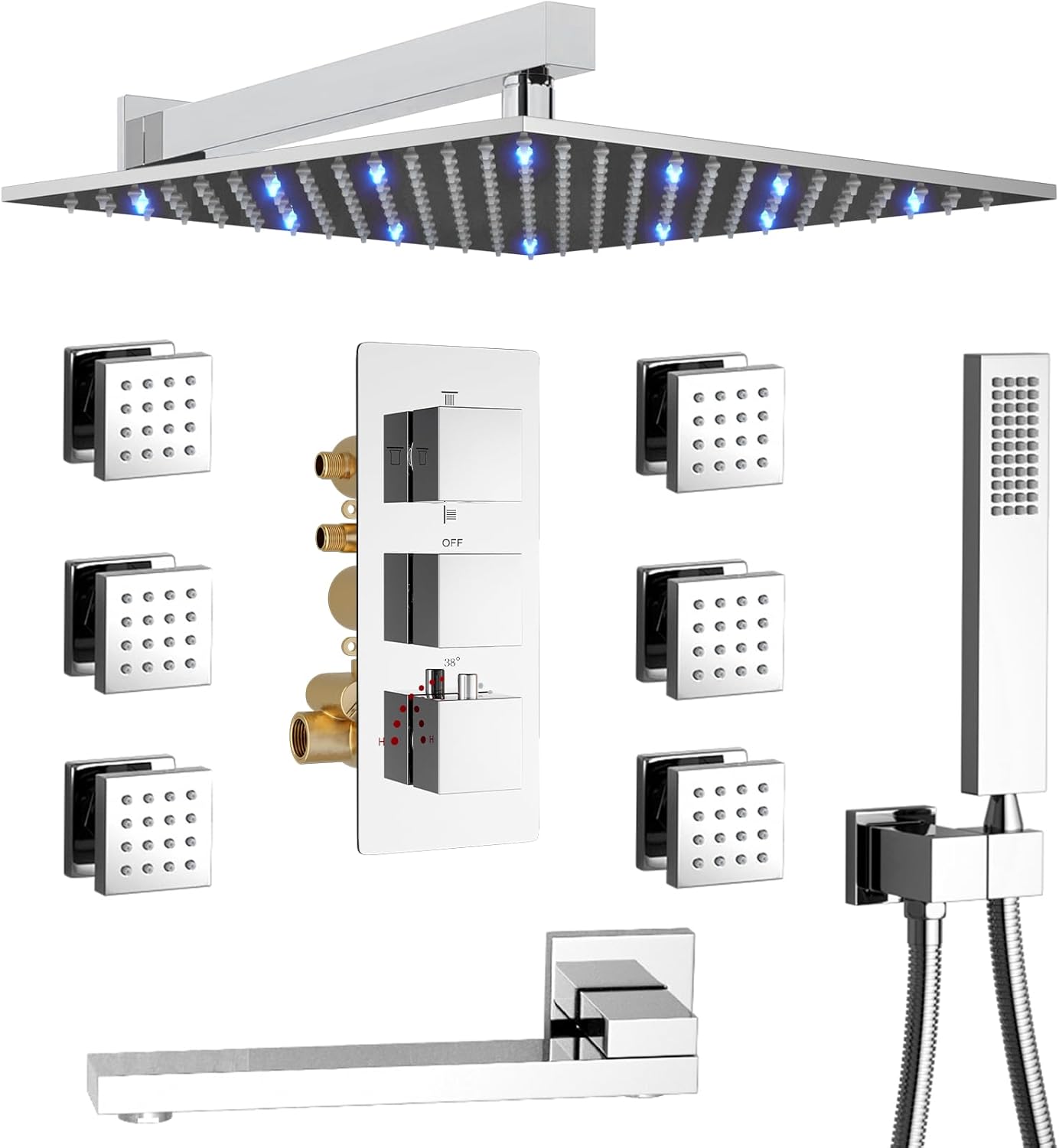 | Included Components | 12 inch Ceiling Mounted Shower Head, 4 Way Thermostatic Shower Valve, 6 PCS Body Jet, Handheld Spray, Tub Spout |