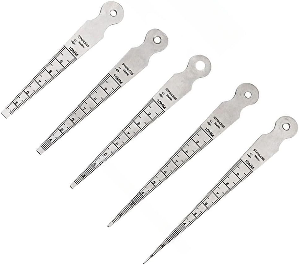 Features:- Compact and lightweight, fits in a pocket.- Clear and accurate lettering, fade-resistant.- Made of high-quality stainless steel.- Thickened pen body design, resistant to deformation.Specifications:Part Name: Wedge Feeler Gauge 1-10mm 5-Piece SetSize: As shownColor: [Image not provided]Model: 5-piece setNumber of Blades: 5 bladesLength: 182mmBlade Shape: TriangularFeeler Thickness: 1mmMaterial: Stainless SteelMeasuring Range: 1-10mmPackage Contents: 5 * Wedge Feeler Gauges