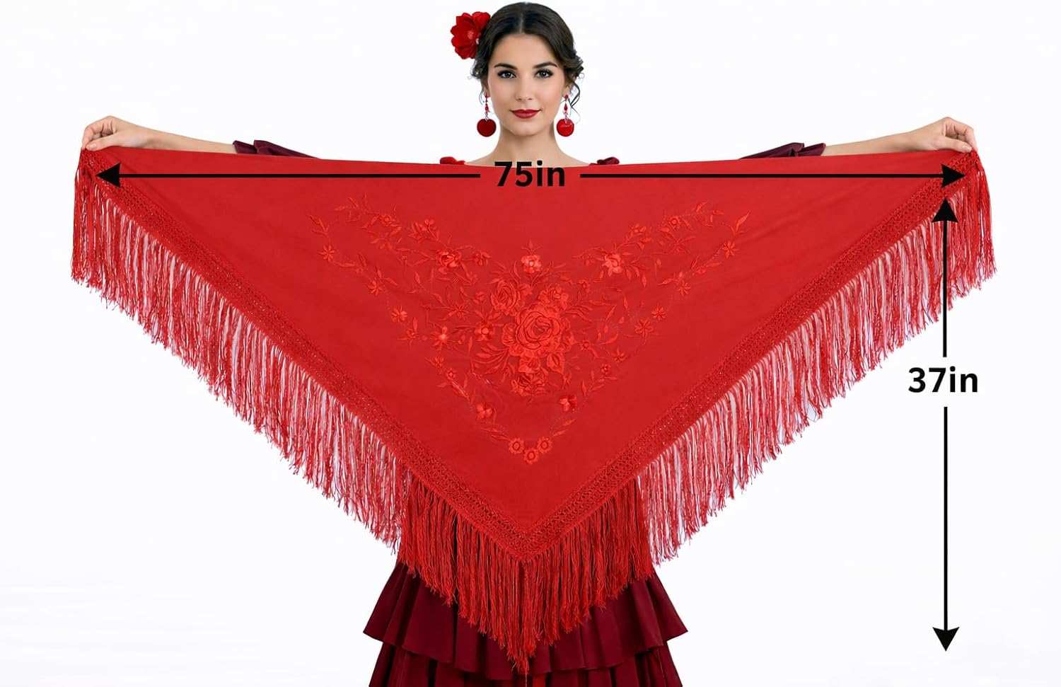 Large embroidered dance beak with red fringe, flowers and red fringe. Embroidered roses on one side. Machine made / embroidered in silky fabric, trimmings and knit fringes. Size XL Measurements: 190 x 90 cm (without fringe) + 5 cm trimming