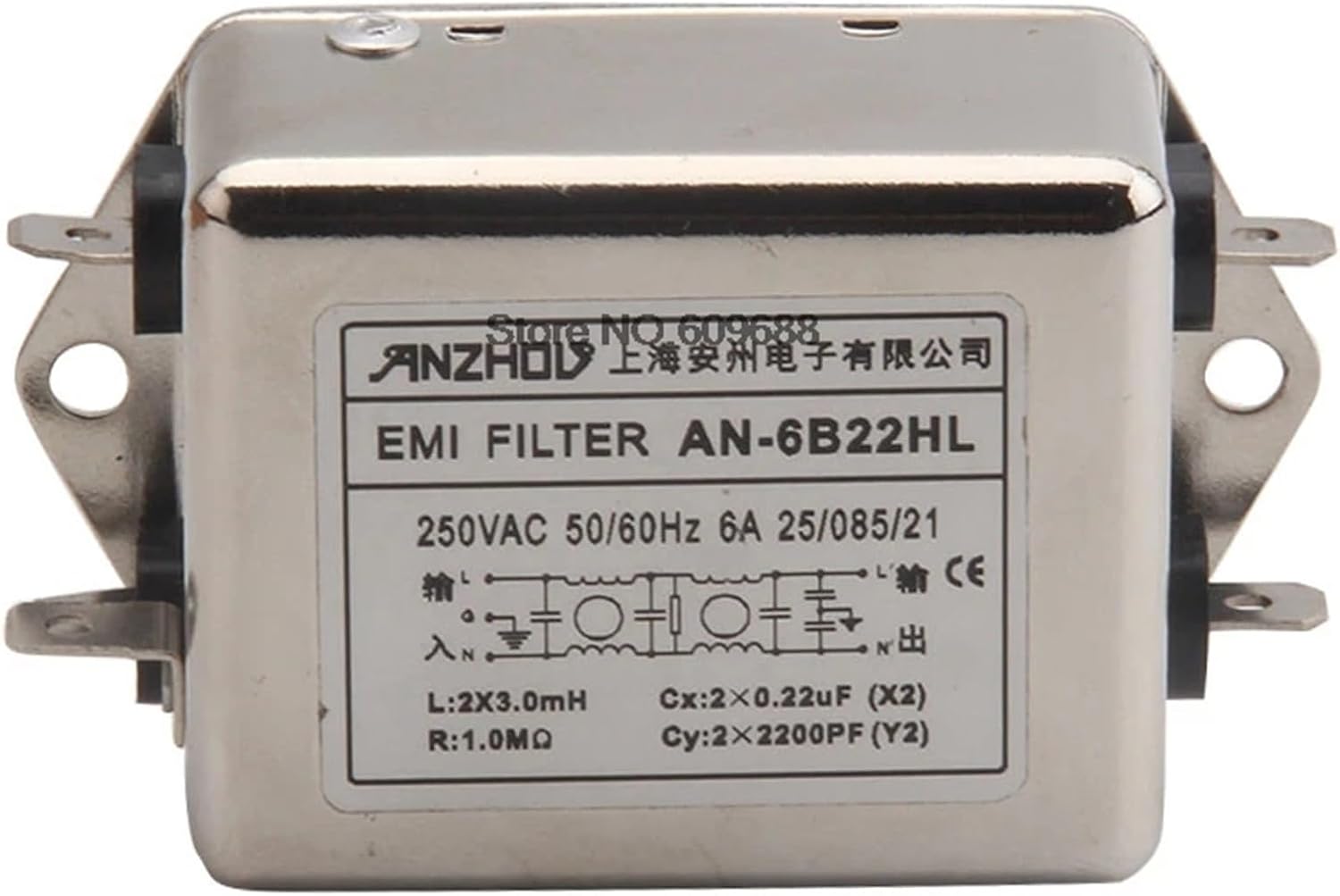 Electromagnetic Interference FiltersTechnical parameterRated voltage250VAC MAXworking frequency50/60HzTest voltageLine-line1450VDC 2 secondsRated current1-20ALine-ground2250VDC 2 secondsClimate category25/85/21Product ListProduct numberCircuit diagramRated currentLeakage currentDimensionsConnection methodAN-3B22HLfigure 13A0.5mAfigure 1LugAN-5B22HLfigure 15A0.5mAfigure 1LugAN-6B22HLfigure 16A0.5mAfigure 1LugAN-10B22HLfigure 110A0.5mAfigure 1LugAN-15B22HLfigure 115A0.5mAfigure 1LugAN-20B22HLfigure 120A0.5mAfigure 1Model Number : AN-10B22HL AN-15B22HL AN-20B22HLCoil Category : Ferrite Magnetic Core-Coil