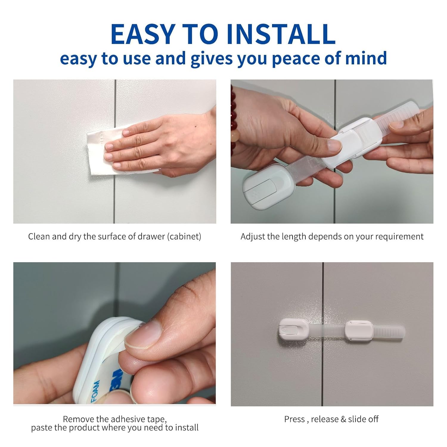 Baby Child Safety Kits, 6 Strap Locks, 8 Drawer Locks, 10 Corner Guards, 16 Pieces of Socket Covers with 3 Keys Baby Safety Locks for Multiple Use - The flexible and adjustable strap works on flat surfaces and around corners. Baby safety cabinet locks install easily in seconds. Simply peel off the backing and press the 3M adhesive to any clean, dry surface. Will not heal or damage your furniture. Securely close your cabinets, drawers, appliances, toilets, bins, windows, pet food containers and more. Keep your little ones away from all hazards in your home.