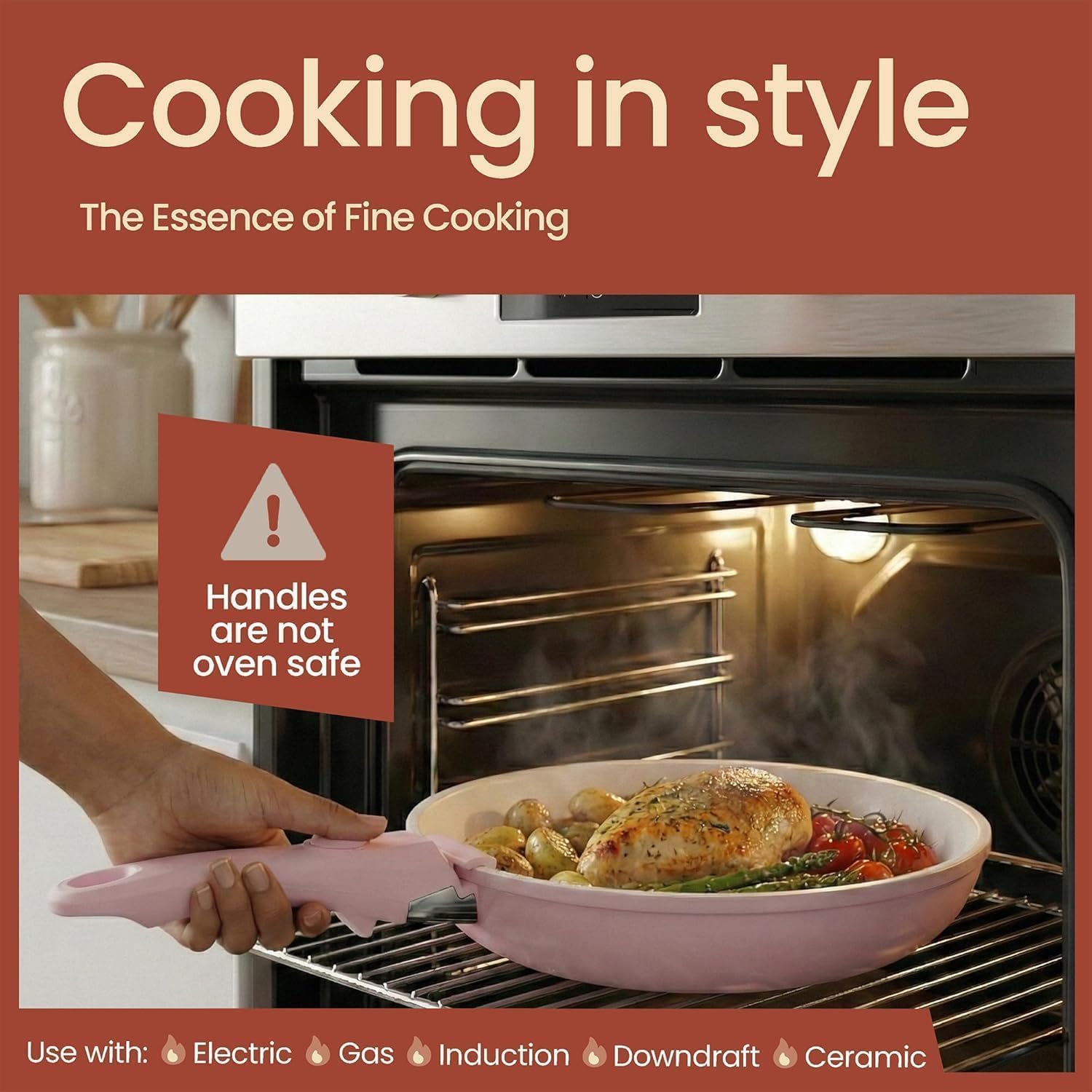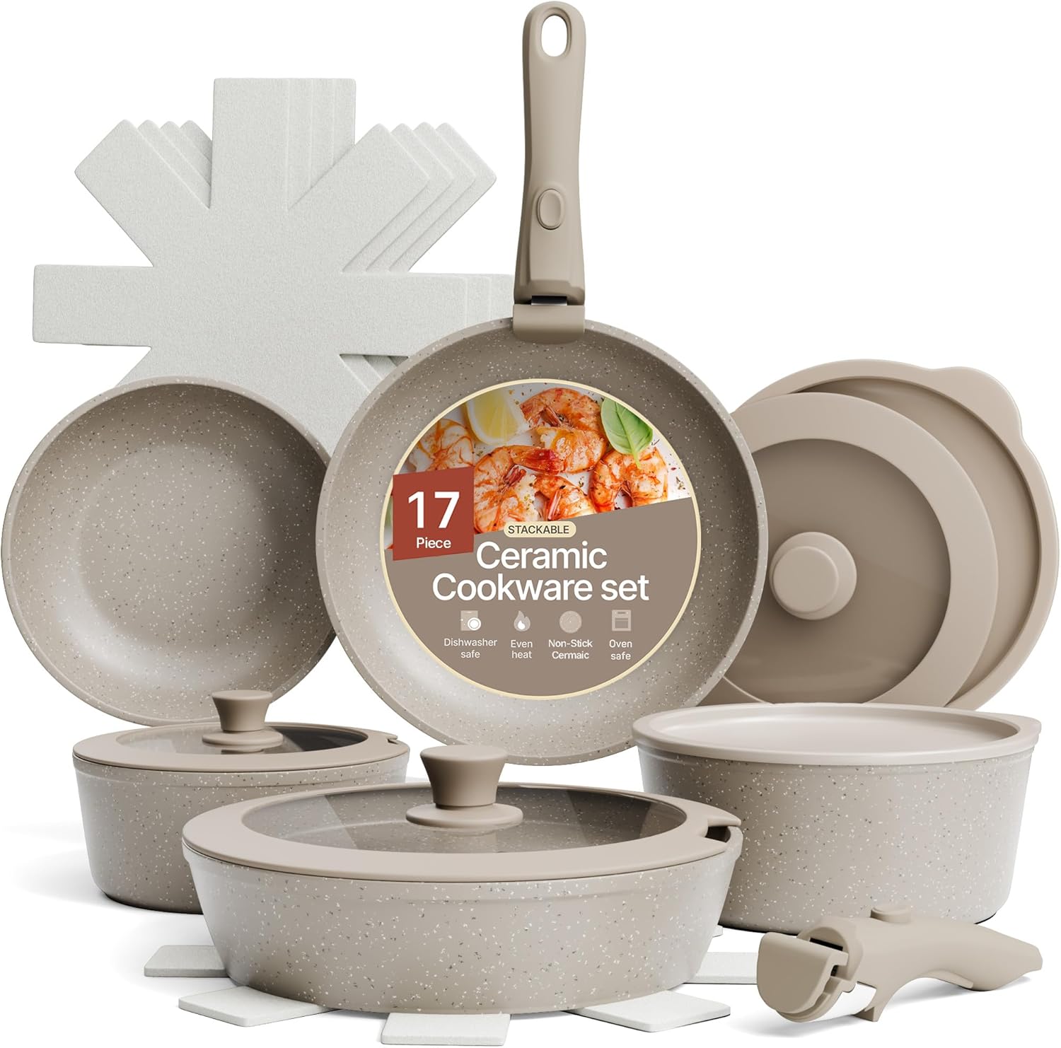 Upgrade your kitchen with the BAKKEN 17-Piece Ceramic Coated Aluminum Cookware Set, a versatile collection designed for everyday cooking and family feasts. This complete set equips you with two fry pans, a saucepan with lid, a Dutch oven with lid, a deep sauté pan with lid, and a full suite of silicone utensils—including ladle, tong, slotted turner, spaghetti server, and oven mitts—for a well-rounded culinary toolkit. Each piece features a durable aluminum alloy construction with a thick 1.5” base, promoting fast, even heating while reducing hotspots. The ceramic nonstick interior and exterior allow effortless food release and hassle-free cleanup without the use of PTFE, PFAS, or BPA. Strong riveted stainless steel handles provide lasting strength and control, while the set’s oven- and dishwasher-safe design (except mitts) adds convenience. Compatible with gas, induction, ceramic, glass, and halogen cooktops, this cookware set adapts seamlessly to your cooking style. With the perfect balance of safety, durability, and everyday practicality, the BAKKEN 17-piece set is ready to handle everything from quick weeknight dinners to weekend entertaining.