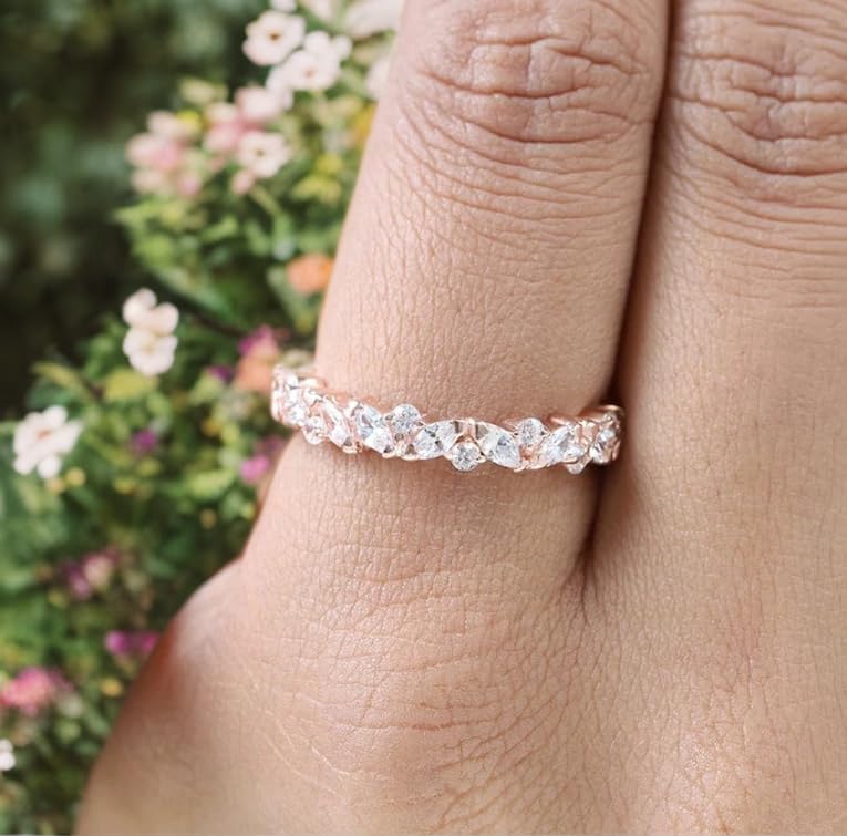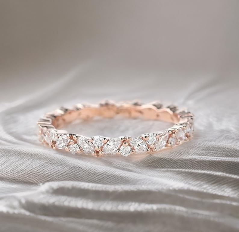 Elevate your love story with our Exquisite 925 Sterling Silver Wedding Band, a stunning piece designed to embody elegance and timeless beauty. This captivating ring features a harmonious arrangement of marquise and round cut moissanite stones, creating a dazzling display that perfectly symbolizes your commitment. Whether as a wedding band, an engagement ring, or a thoughtful gift for a loved one, this ring is sure to leave a lasting impression.Craftsmanship and QualityCrafted from high-quality 925 sterling silver, this wedding band offers exceptional durability and a brilliant shine that will withstand the test of time. The silver is hypoallergenic, making it a comfortable choice for all wearers, including those with sensitive skin. Each ring is meticulously polished to perfection, showcasing the artistry and craftsmanship that goes into every detail, ensuring a piece that is not only beautiful but also made to last.Stunning Moissanite StonesAt the heart of this exquisite ring are the carefully selected moissanite stones. Renowned for their remarkable brilliance, moissanite offers a stunning alternative to traditional diamonds, exhibiting a captivating sparkle that is sure to catch the eye. The combination of marquise and round cuts creates a visually striking contrast, enhancing the ring's overall elegance. The marquise cut, with its elongated shape, adds a touch of sophistication, while the round cut stones provide classic charm and brilliance.Elegant DesignThe design of this wedding band is both modern and timeless, making it the perfect choice for brides who appreciate classic elegance. The sleek silhouette complements a variety of engagement ring styles, allowing for effortless stacking or wearing alone for a minimalist look. The thoughtful arrangement of the moissanite stones is not only visually appealing but also symbolizes the enduring nature of love and commitment.Versatile Gift OptionPresented in a beautifully designed gift box, this wedding band makes for an ideal gift for a variety of occasions. Whether you’re celebrating a wedding, anniversary, birthday, or any special moment, this ring is a meaningful way to express your love and affection. Its timeless design ensures that it will be cherished for years to come, making it a wonderful addition to any jewelry collection.Ethical SourcingWe are committed to ethical sourcing practices, ensuring that all moissanite stones used in our rings are conflict-free. By choosing this exquisite wedding band, you are supporting responsible practices in the jewelry industry and contributing to a more sustainable future. This commitment to ethics adds an extra layer of significance to your purchase, allowing you to wear your ring with pride.Care and MaintenanceTo keep your wedding band looking its best, it’s important to follow some simple care instructions. Clean the ring regularly with a soft cloth to remove dirt and oils. For a deeper clean, use a mild soap solution and a soft brush to gently scrub the stones and band. Store the ring in a dry place, preferably in its original box, to avoid scratches and maintain its shine over time.