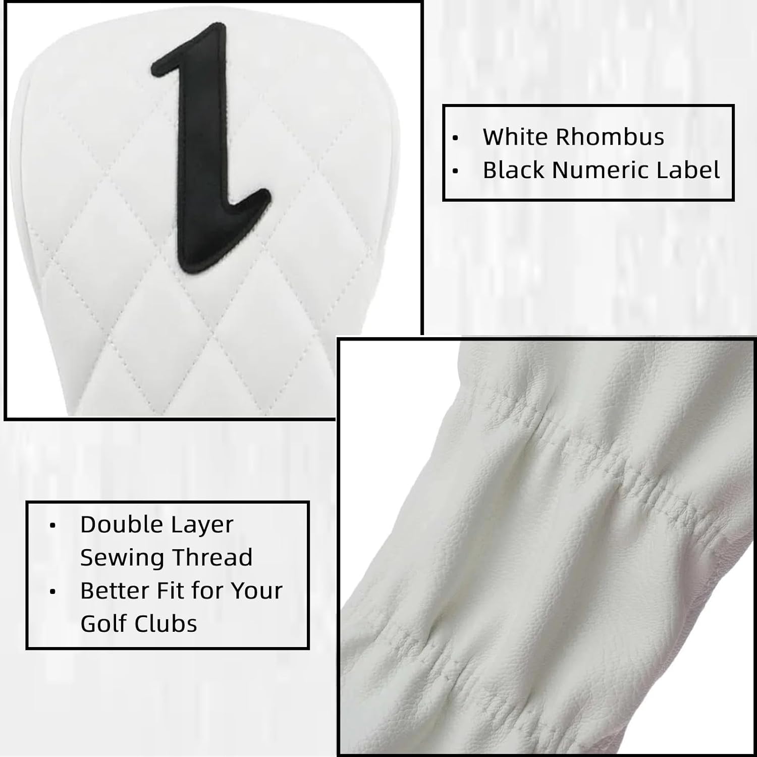 HELLO NRC's 3 pcs golf club head covers combine exquisite craftsmanship with unique design to become your trusted companion in the golf bag. We remain committed to creating premium products and delivering a comfortable customer experience. From material selection to detailed design, these white wood club head covers provide comprehensive protection for your clubs while showcasing a minimalist and stylish aestheticCore Product Features for Enhanced Protection:1. Lightweight Design: Putting on and taking off the 3 wood club cover white leather are effortless, adding no extra weight to your bag for easier club transport. 2. Superior Water & Stain Resistance: The outer layer of the 3 wood headcover plain effectively blocks water spots and minor stains, preventing moisture or dirt from reaching your clubs and keeping them clean.3. Exceptional Durability: Crafted from premium materials with reinforced stitching, the 3pc leather club head covers withstands long-term use, providing lasting protection for your clubs.4. Easy Maintenance: If accidentally stained, simply wipe the white driver headcover clean—no tedious cleaning required.Premium Materials, Minimalist Design:Featuring a classic white primary color, the fairway wood headcover plain white boast a sleek, minimalist design that complements your refined taste while effortlessly blending with any golf bag style, making it a standout accessory.1. Outer Layer: Crafted from high quality waterproof PU leather, the waterproof club head covers offer exceptional water resistance with excellent abrasion and tear resistance, effectively shielding clubs from external impacts.2. Lining: Soft suede material provides a smooth, skin-friendly feel. It gently wraps the club head to prevent scratches from friction, offering thoughtful protection.Precision Sizing, 3-Piece Set Meets Your Needs: Driver Cover: 36*16 cm / 14.2*6.3 inFairway Wood Cover: 30*13 cm / 11.8*5.1 in The precise dimensions ensure a snug fit around the club head, preventing the cover from slipping during transport and offering tailored protection for golf clubs of various sizes. Snugly fits the clubhead to prevent the cover from slipping off during transport, offering tailored protection for various golf club specifications.Please note:Due to lighting effects during photography, display variations across devices, and individual color perception differences, the golf club head covers full set's color may slightly differ from the images. The actual product color will be as received. If you have any questions about the product, please contact us