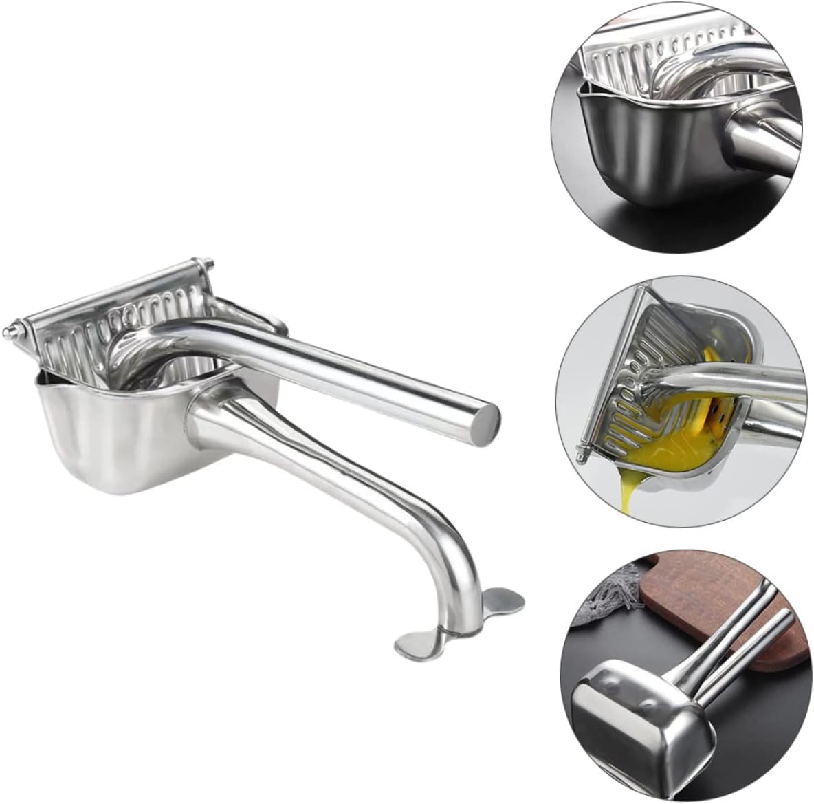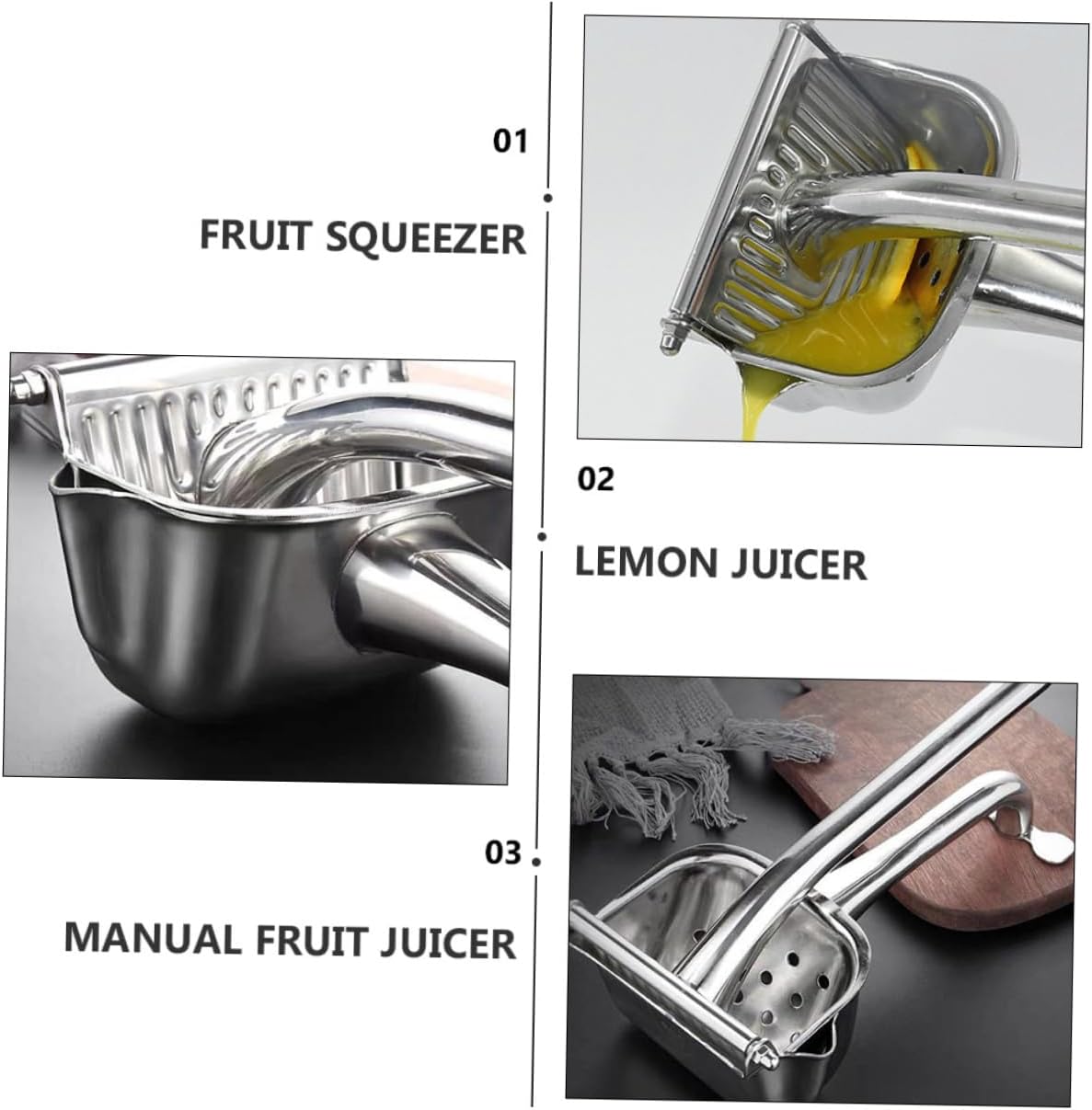 Package Include 1 x Handheld Fruit Juicer Characteristics -Material: Stainless Steel. Fruit Squeezer -Color: Silver, Fruit Juicer -Size: About 25.00X11.00X8.50cm/9.82X4.32X3.34inch. Lemon Juicer - A great to your friends, family and co-worker. Hand Press Juicer - Made of stainless steel material, and for use. Handheld Fruit Juicer - Suitable for lemon, orange, , grapefruit and other fruit. Household Fruit Juicer - Portable handle, smooth and delicate, easy to grip. Manual Fruit Juicer - It is more for juicing and easier for cleaning. Lemon ClipGoods DescriptionHandheld Fruit Juicer Are you looking for a professional, yet fruit juicer? Are you in search of a sturdy, trustworthy tool that can do multiple jobs at once? , ! Our professional fruit juicer must meet you needs.Lemon Clip It is one of the choices for you
