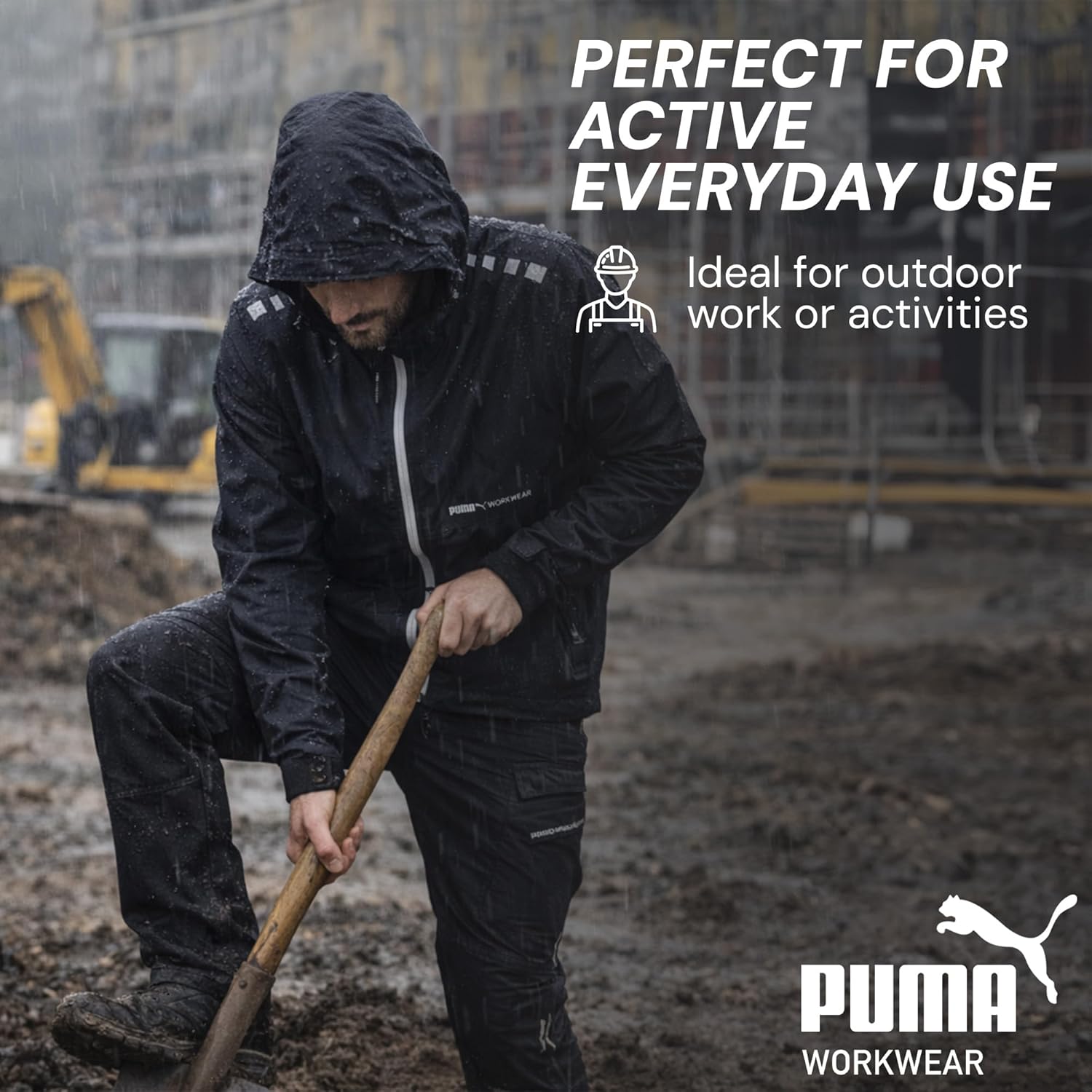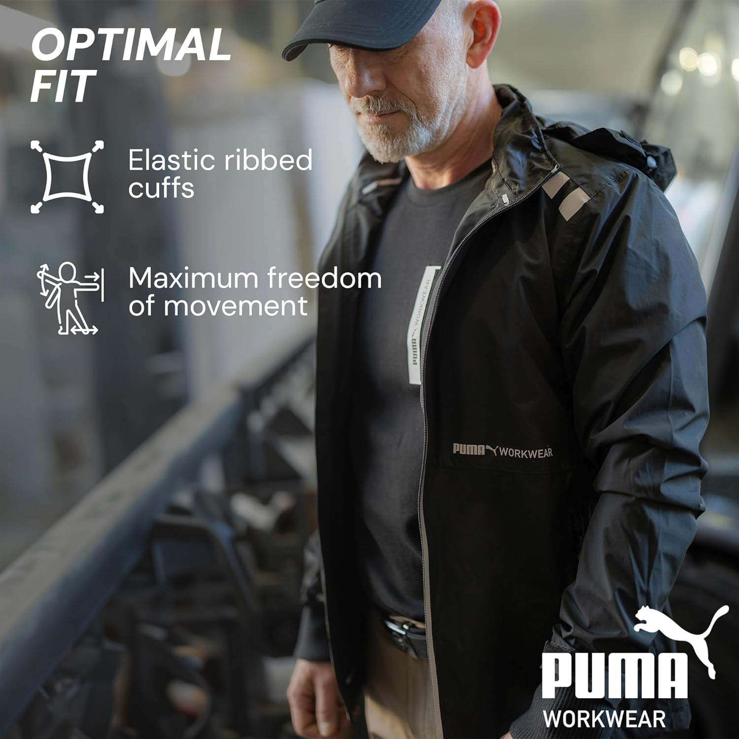 PUMA Workwear Men's Rain Jacket – Durable All-Weather Protection for Work and OutdoorsStay Dry, Comfortable, and Prepared for Any WeatherThe PUMA Workwear Men's Rain Jacket is the ultimate outerwear solution for professionals and outdoor enthusiasts. Designed to tackle harsh conditions,this rain jacket combines rugged durability with smart features to ensure comfort and functionality in every situation, from construction sites to farming fields.Key Features Water-Resistant Material and Sealed SeamsMade from premium, rain-repellent fabric, this jacket offers superior protection during heavy downpours. Its sealed seams prevent water penetration, keeping you dry andcomfortable all day long.Detachable and Adjustable HoodAdapt to changing weather with the zip-off hood. Easily adjustable with a drawstring system, it ensures a secure fit, providing added coverage when you need it most.Adjustable Velcro Cuffs Customize your sleeve fit with Velcro closures that offer enhanced comfort and create a barrier against wind and rain, keeping you warm in any environment.Knit Cuffs for Added ProtectionThe knit cuffs at the sleeve ends add an extra layer of comfort while sealing out cold air. This thoughtful feature helps maintain warmth and ensures a snug fit around the wrists.Spacious Inner PocketsWith three conveniently located inner pockets, you can securely store your essentials, such as tools, keys, or a smartphone. The pockets are designed for easy access,making this jacket as practical as it is protective.Why Choose PUMA Workwear?Engineered with a focus on durability, functionality, and style, the PUMA Workwear Men's Rain Jacket is the perfect companion for challenging workdays andunpredictable weather. Its versatile design suits professionals in construction, agriculture, and outdoor trades, as well asanyone seeking reliable rain protection. Elevate Your Workwear WardrobeStay prepared and comfortable without compromising on performance. The PUMA Workwear Men's Rain Jacket delivers top-tier protection and convenience, making it an essential addition to your gear.Invest in a jacket that works as hard as you do – order your PUMA Workwear Men's Rain Jacket today!