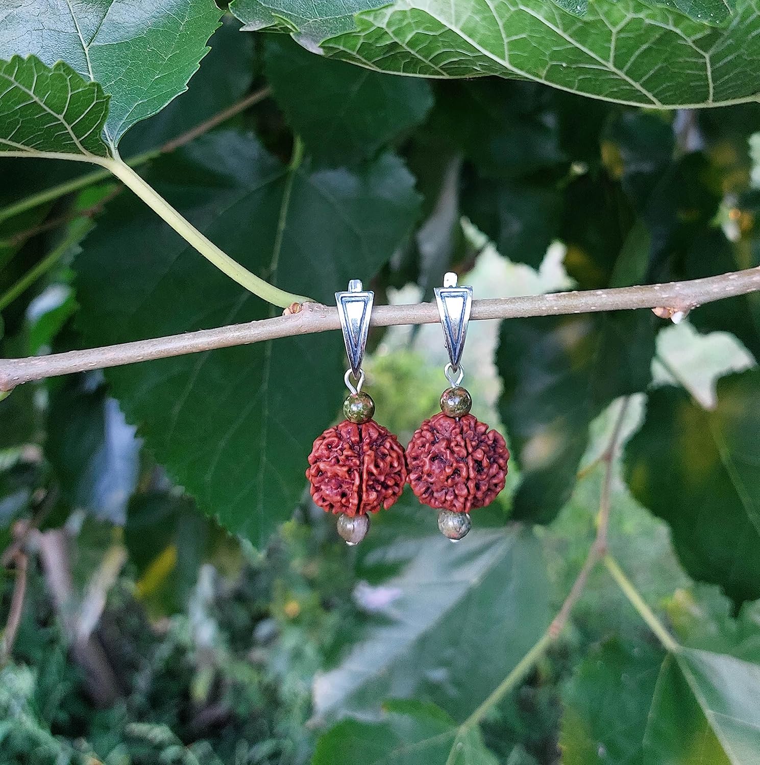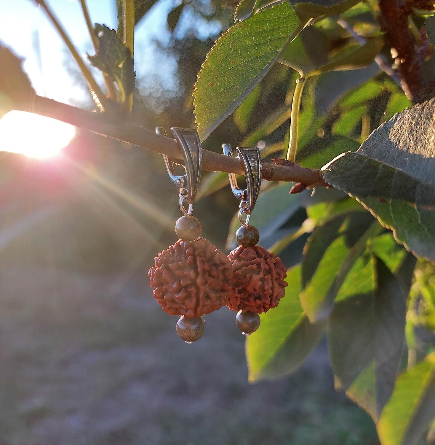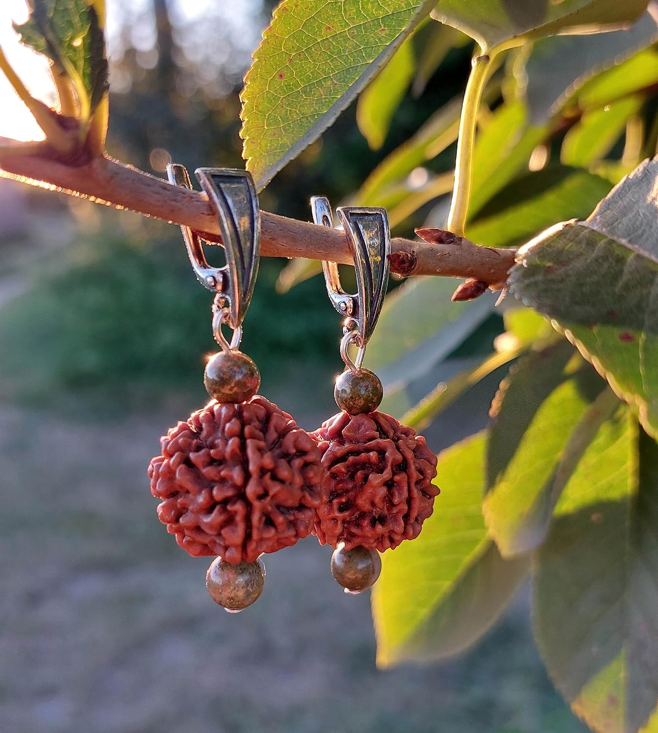 Beautiful earrings with balancing & protection power of Unakite Jasper crystals and healing power of Rudraksha Mala beads. Made of original 5 Mukhi big Rudraksha seeds and high quality sterling silver 925 findings. Deeply spiritual jewelry for your everyday life. Great meaningful gift for yoga lovers. SYMBOLISM: *** UNAKITE stone balances the emotional and spiritual bodies, and provides gentle release of energetic blockages. It helps us to move on from outmoded beliefs from the past. Unakite can open and activate the Third Eye Chakra to receive spiritual insights from higher realms. It's grounding effect can bring a calming influence to any environment, and it is sending out peaceful vibes to all those nearby. Physically, Unakite can protect against electromagnetic pollution from computers or cell phones. Unakite is also used during recovery from trauma or major illnesses, helping the cells to remember the state of perfect health and harmony. *** RUDRAKSHA in Sanskrit means "eye of Shiva" or "tears of Shiva". Rudra is one of the names of the Indian Lord Shiva. Rudraksha is known for its sacred and healing power. By wearing these beads one gets tranquility, peace of mind, focus and concentration. This kind of state of mind is equally ideal for meditation. People can wear Rudraksha for protection, blessings, good fortune, health and well-being. In a spiritual sense, Rudraksha creates a cocoon of your own energy, and it is also a kind of shield against negative energies.