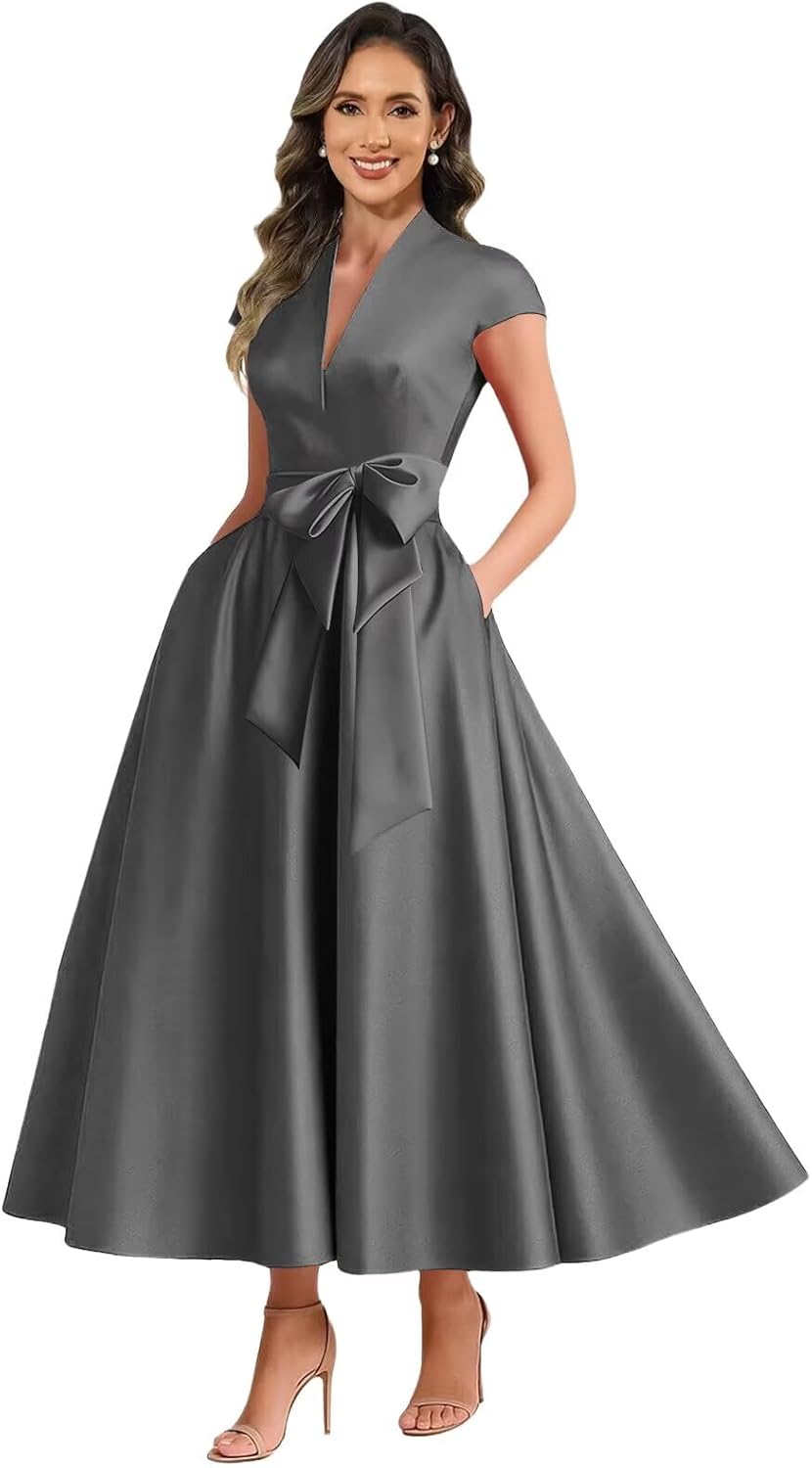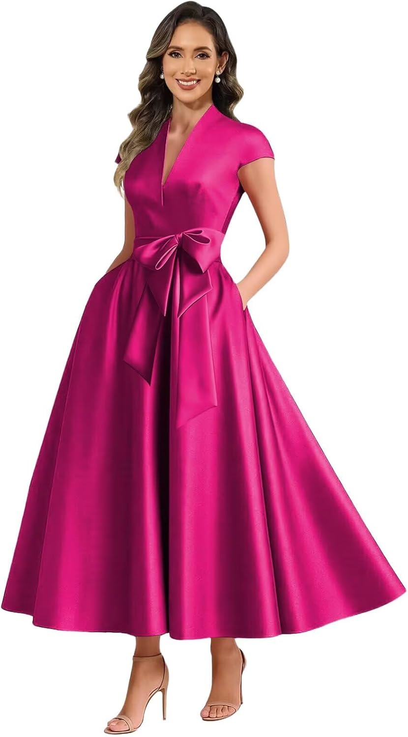 Welcome to Xuzey Xuzey Tea Length Satin Mother of The Bride Dresses for Wedding A Line V Neck Cap Sleeve Formal Evening Gown with Bow Long Xuzey's design is inspired by the lifestyle and culture of modern cities, integrating the elements of Eastern tradition and Western fashion to create a clothing collection with unique personality and taste. With the design concept of simplicity, fashion and comfort, the brand is committed to providing young people with high-quality fashion items, so that they can show their unique style in different occasions. Each piece is handmade, pls choose from the wardrobe which created for you. How to choose size Measure your body and compare it with our size chart. If you want a more accurate fit, please send us your measurements as follows: 1.Bust___inches 2.Waist___inches 3.Hips___inches 4.Hollow to floor ___inches 5.Height(without shoes)___inches 6.The date you need the dress:____ Size 0: Bust=32 Waist=24.75 Hips=35.75 Hollow to floor=58; Size 2: Bust=33.25 Waist=26 Hips=36.5 Hollow to floor=58; Size 4: Bust=34 Waist=27 Hips=37.5 Hollow to floor=58; Size 6: Bust=35.25 Waist=28.25 Hips=38.5 Hollow to floor=59; Size 8: Bust=36.5 Waist=29 Hips=39.5 Hollow to floor=59; Size 10: Bust=37.5 Waist=30.25 Hips=40.25 Hollow to floor=60; Size 12: Bust=38.5 Waist=31.5 Hips=42 Hollow to Floor=60; Size 14: Bust=40 Waist=33 Hips=43.25 Hollow to floor=61; Size 16: Bust=41.75 Waist=34.75 Hips=44.5 Hollow to floor=61; Size 16W: Bust=43.25 Waist=36.5 Hips=46.5 Hollow to floor=61; Size 18W: Bust=45.75 Waist=39.25 Hips=48.5 Hollow to floor=61; Size 20W: Bust=47.25 Waist=41.5 Hips=50.5 Hollow to floor=61; Size 22W: Bust=49.25 Waist=43.25 Hips=52.5 Hollow to floor=61; Size 24W: Bust=51.5 Waist=45.5 Hips=54 Hollow to floor=61; Size 26W: Bust=53.5 Waist=47.75 Hips=56.25 Hollow to floor=61. Size 28W: Bust=56 Waist=50.75 Hips=58.75 Hollow to floor=61.
