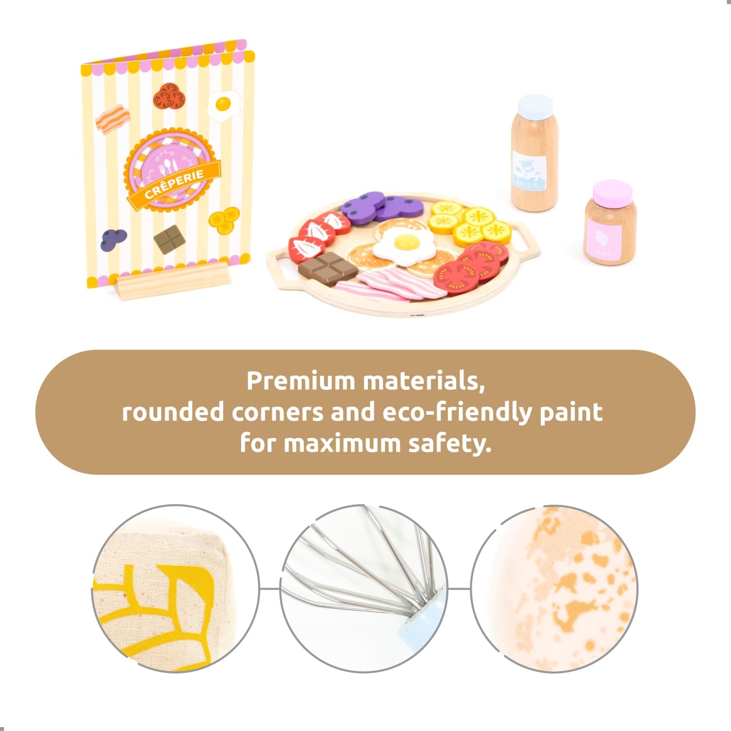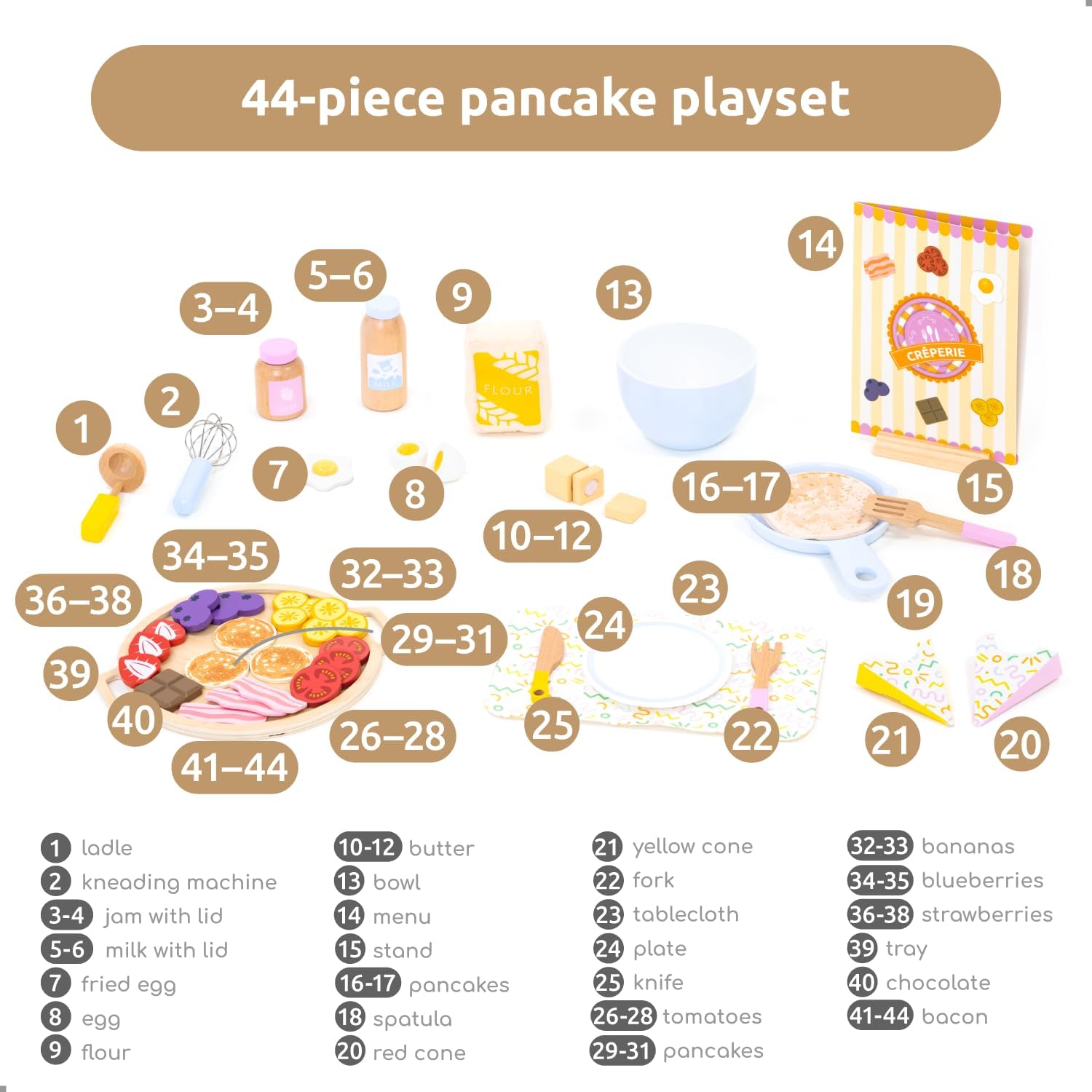 UMU Wooden Pancake Play Set – 44 Pcs Pretend Cooking Toy with Pan, Spatula, Syrup, Toppings & More – Kitchen Play Food Set for Kids Ages 3 4 5