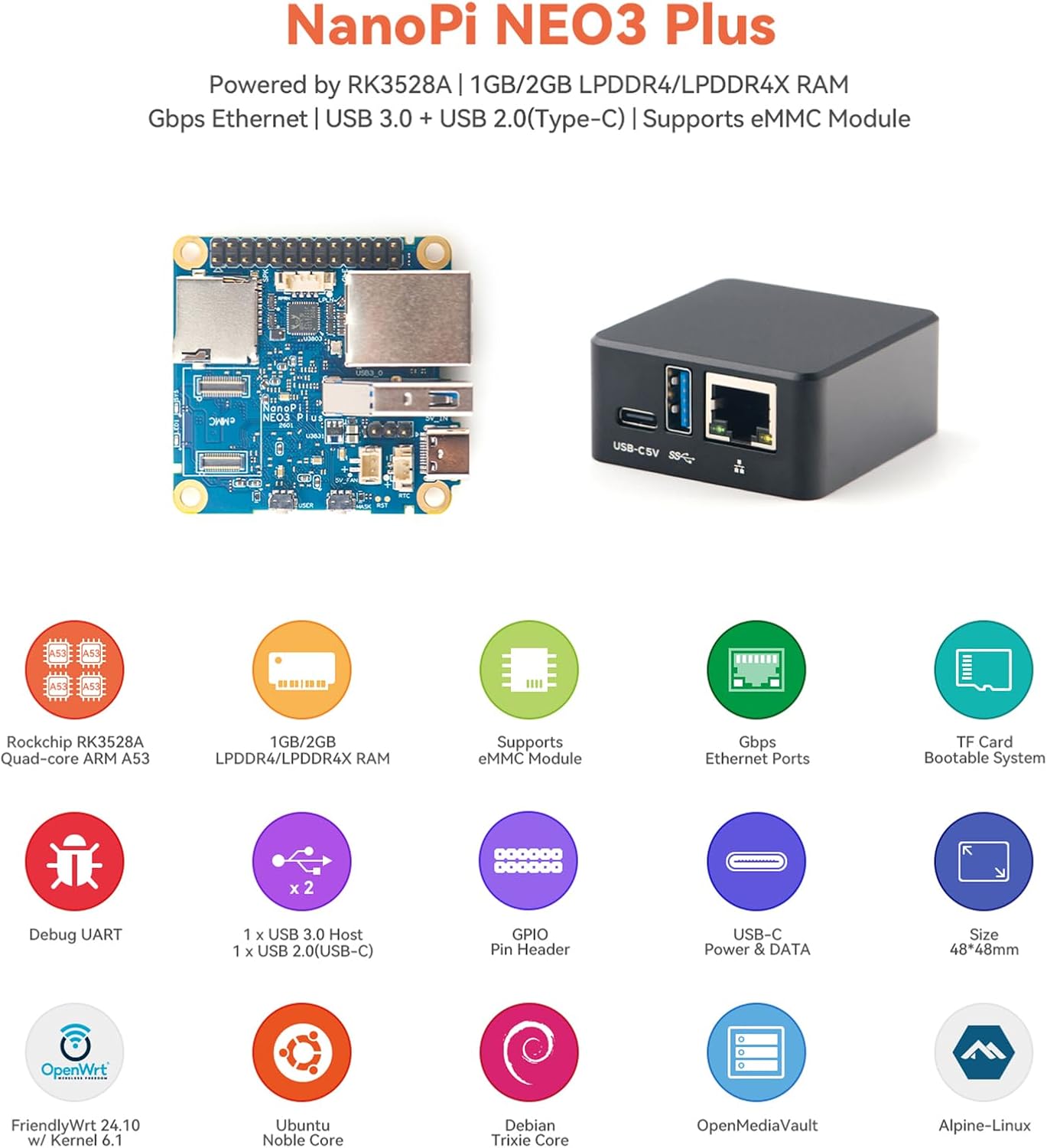 | Operating System | Ubuntu 24.04 Core, Debian 12 Core, FriendlyWrt 21.02/23.05/24.10, OpenMediaVault, Alpine Linux, Buildroot, Proxmox VE |
